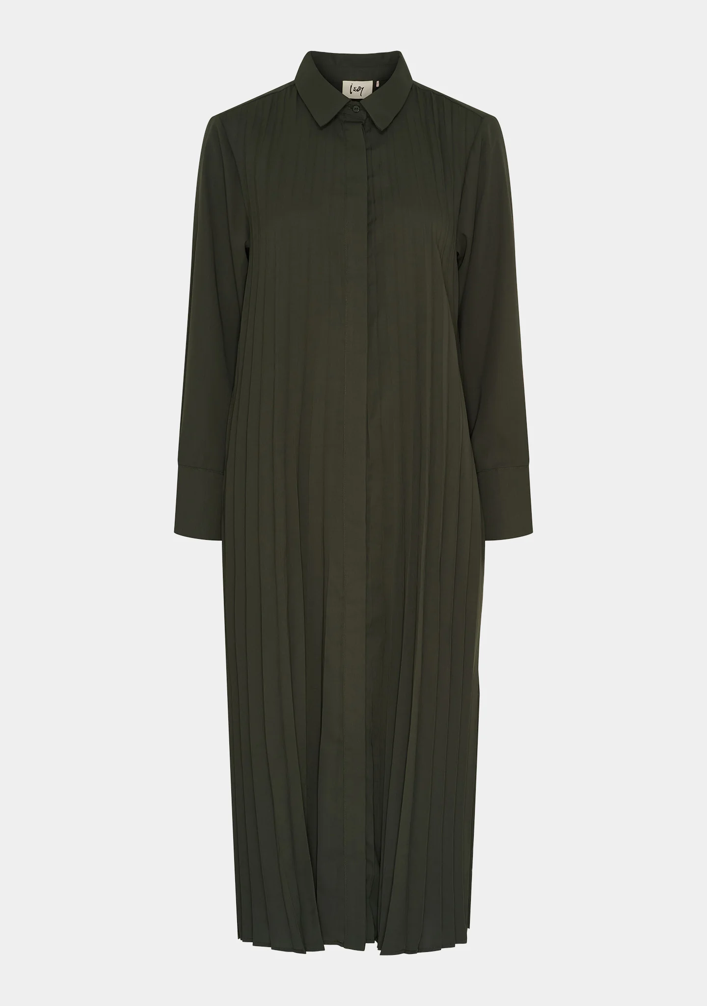 Skøn, lang skjorte kjole fra ISAY. Kjolen er army grøn, med plisserede detaljer hele vejen ned. Kjolen har almindelig krave og skjult knaplukning foran hele vejen ned. Kjolen har sidelommer.