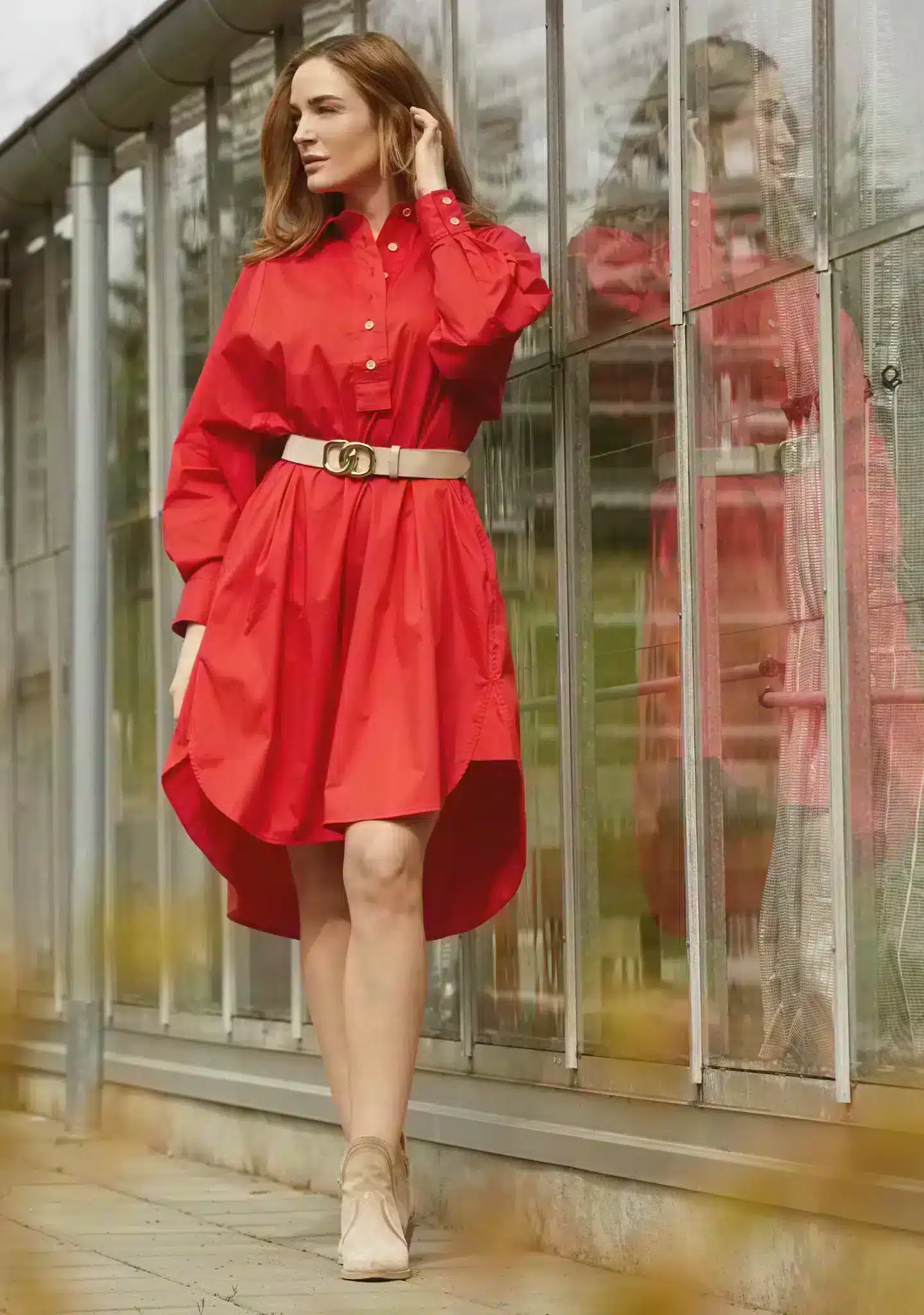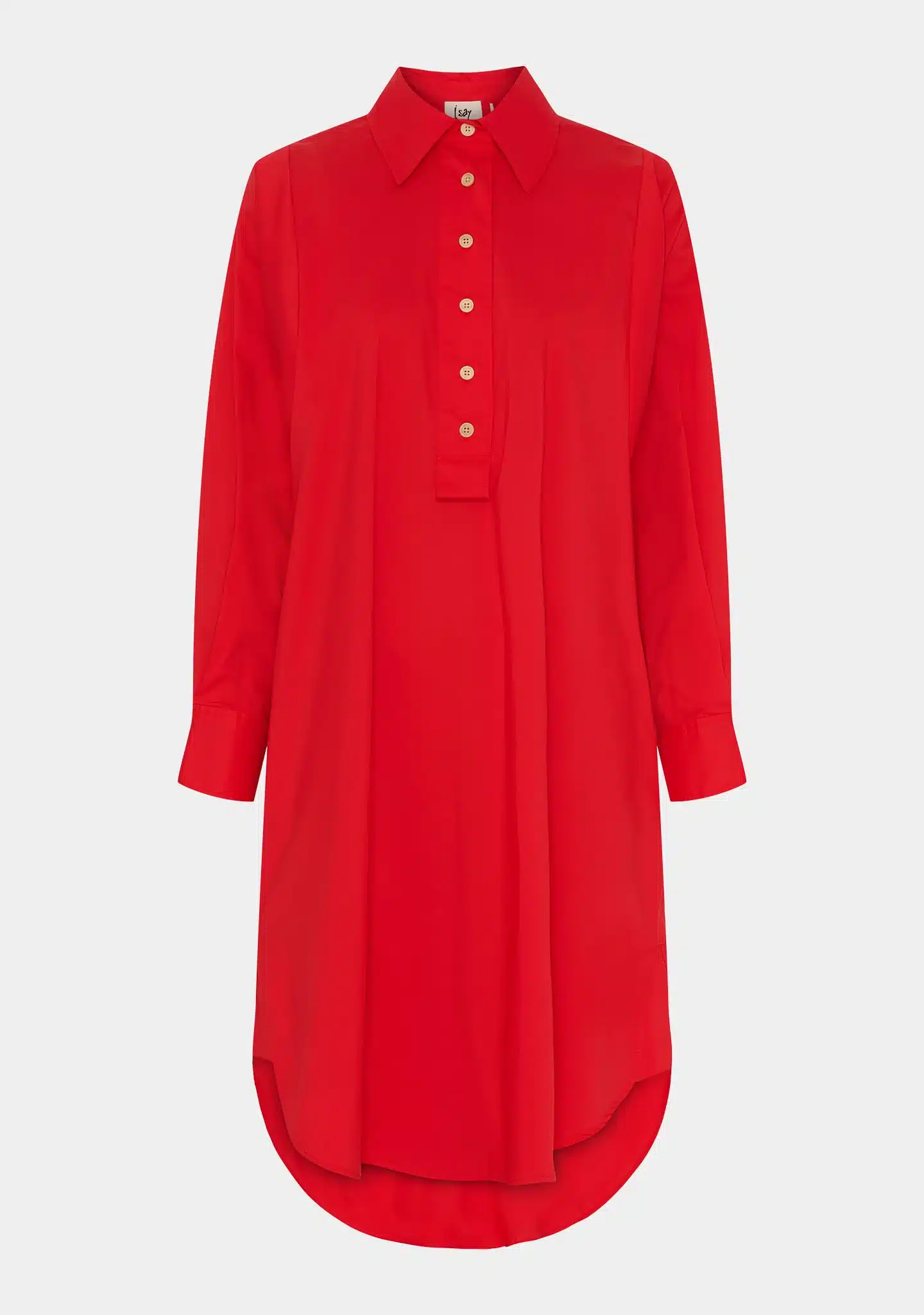 Super fed skjorte kjole fra ISAY. Kjolen er rød, med halv knaplukning foran. Brug kjolen som den er, med et fedt bælte til eller med jeans/skindbukser inden under.