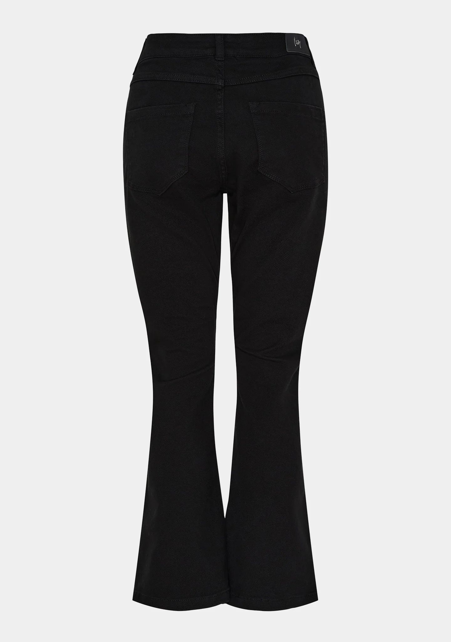 Skønne jeans fra ISAY. Disse jeans er sorte, med flare/trompet bukseben og 7/8 ben længde. Bukserne er lavet i en let strækbar kvalitet og er bløde og komfortable at have på