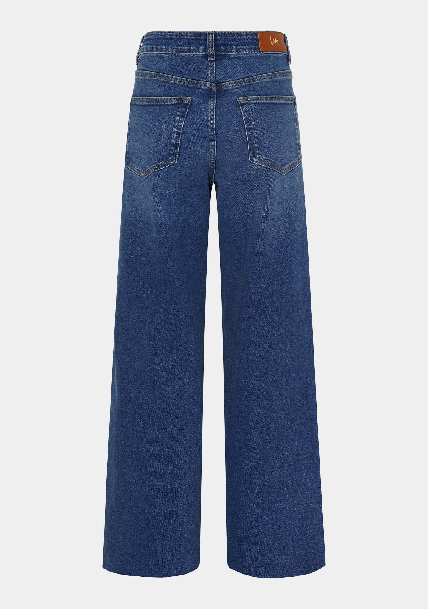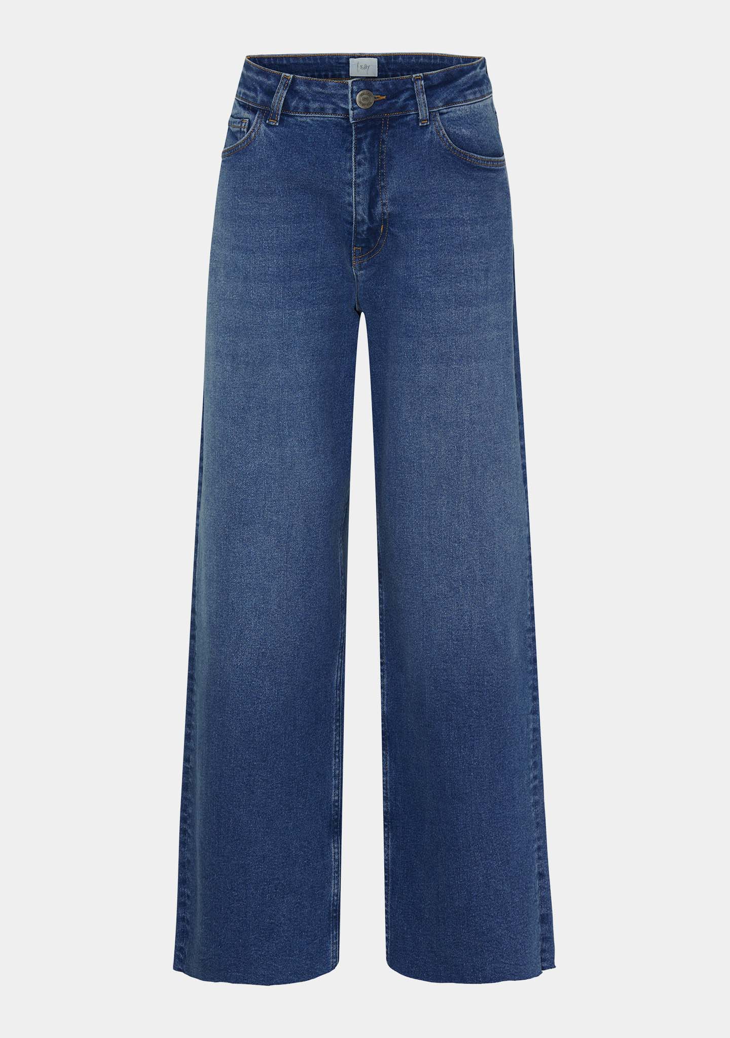 Super fede jeans fra ISAY. Disse jeans er lavet i en fed denim blå vask, med vidde ben og lang benlængde. Bukserne er højtaljede, med 5 lommer og et meget behageligt fit. Bukserne er bløde og stretchy.