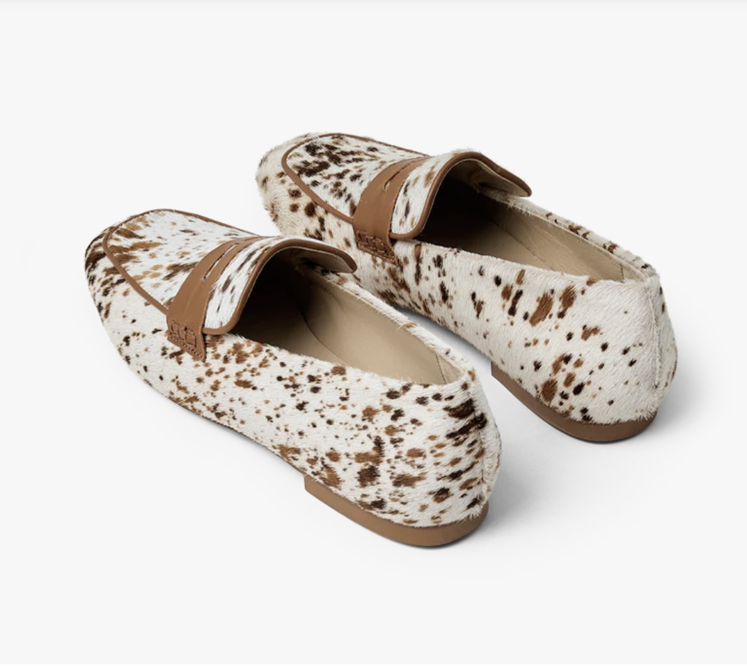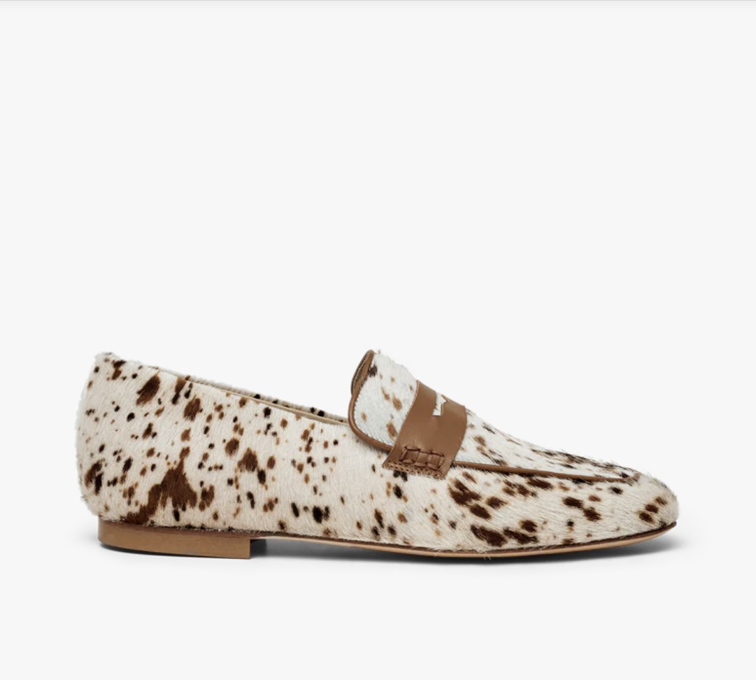 Super cool ko-loafers – lavet i ponyhår med små prikket koprint og et cognac skind bælte over foden. De har en lille hæl på 1 cm.