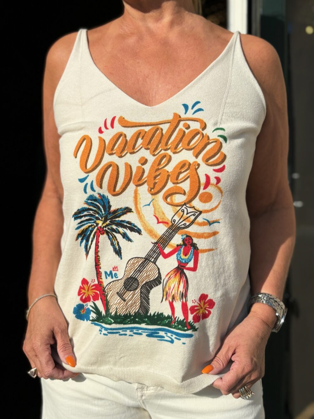 Lækker og blød bomulds top fra Me369. Toppen er hvid, med farverigt print på. Toppen har v-udskæring foran og bagpå og har tynde stropper.