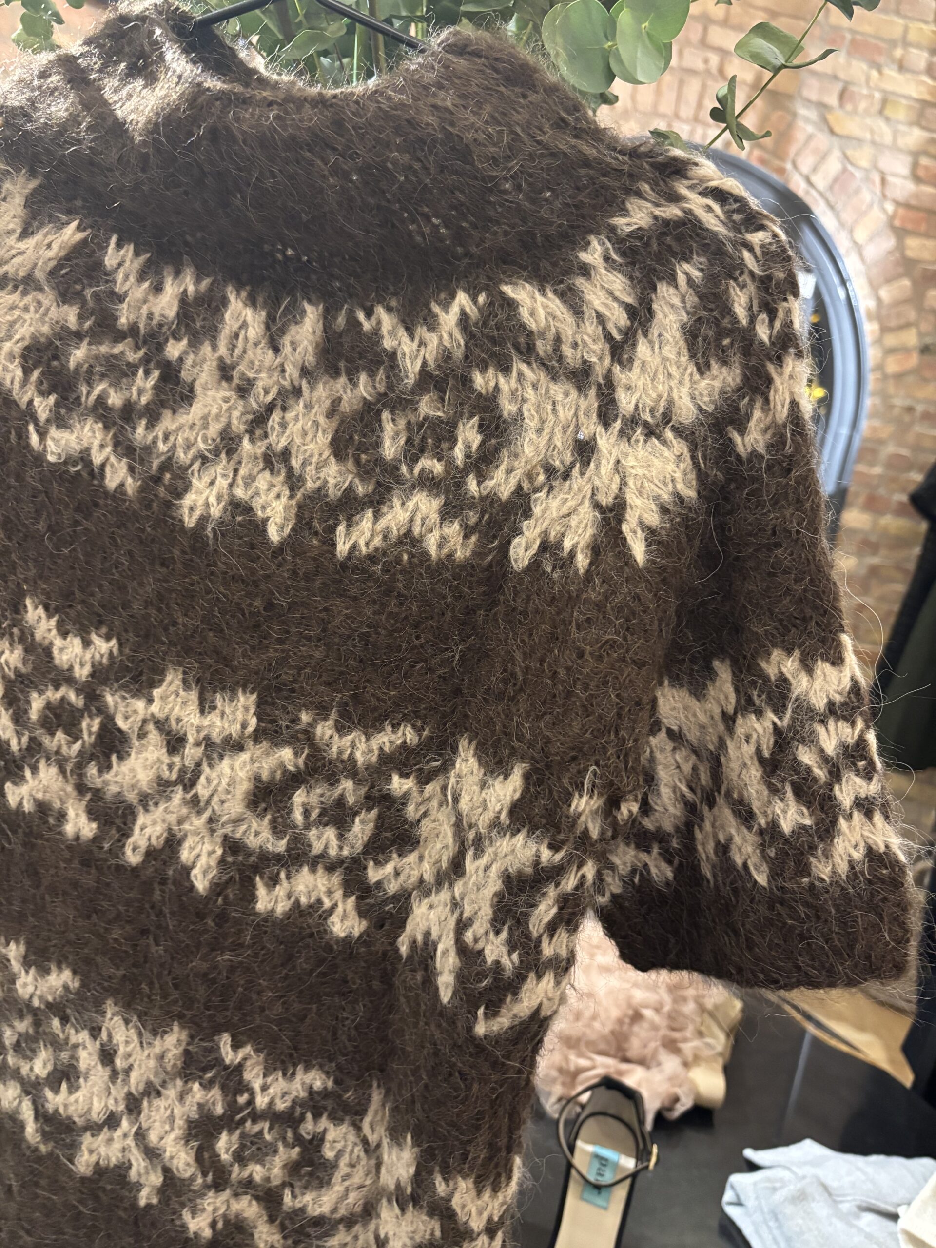 Lækker sweater fra Gudrun & Gudrun. Denne sweater er brun med beige mønster og er håndstrikket af det blødeste alpaca. Denne sweater er tidsløs og passer perfekt til de kolde måneder.