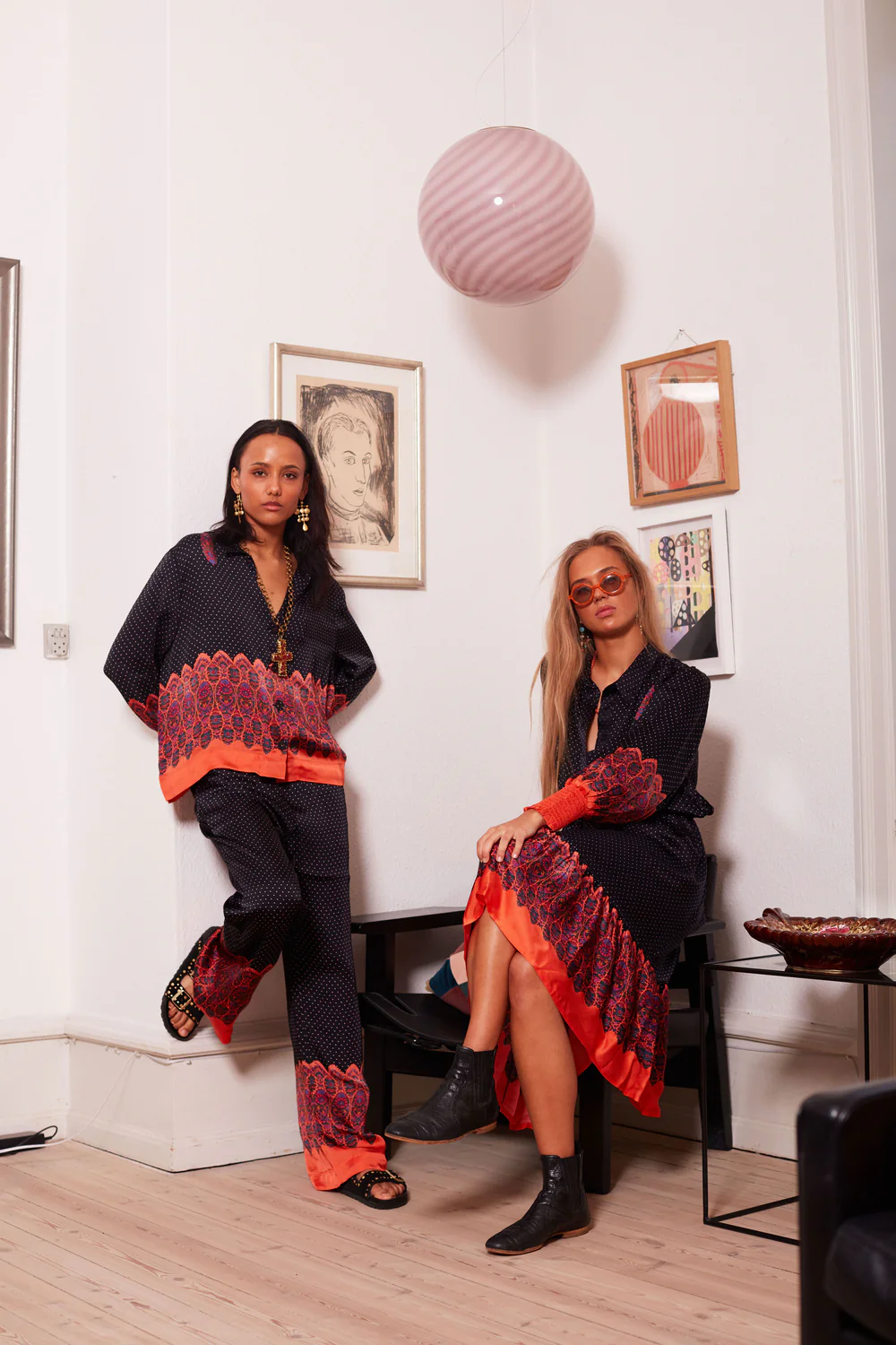 Lækker og blød skjorte fra MW. Skjorten er sort prikket, med smukke røde detaljer og mønstre. Skjorten er lavet i et tungt men lækkert viskose satin stof, som gør den dejlig og behagelig at have på, da stoffet ligger sig blødt til kroppen. Skjorten har knaplukning foran og almindelig krave.