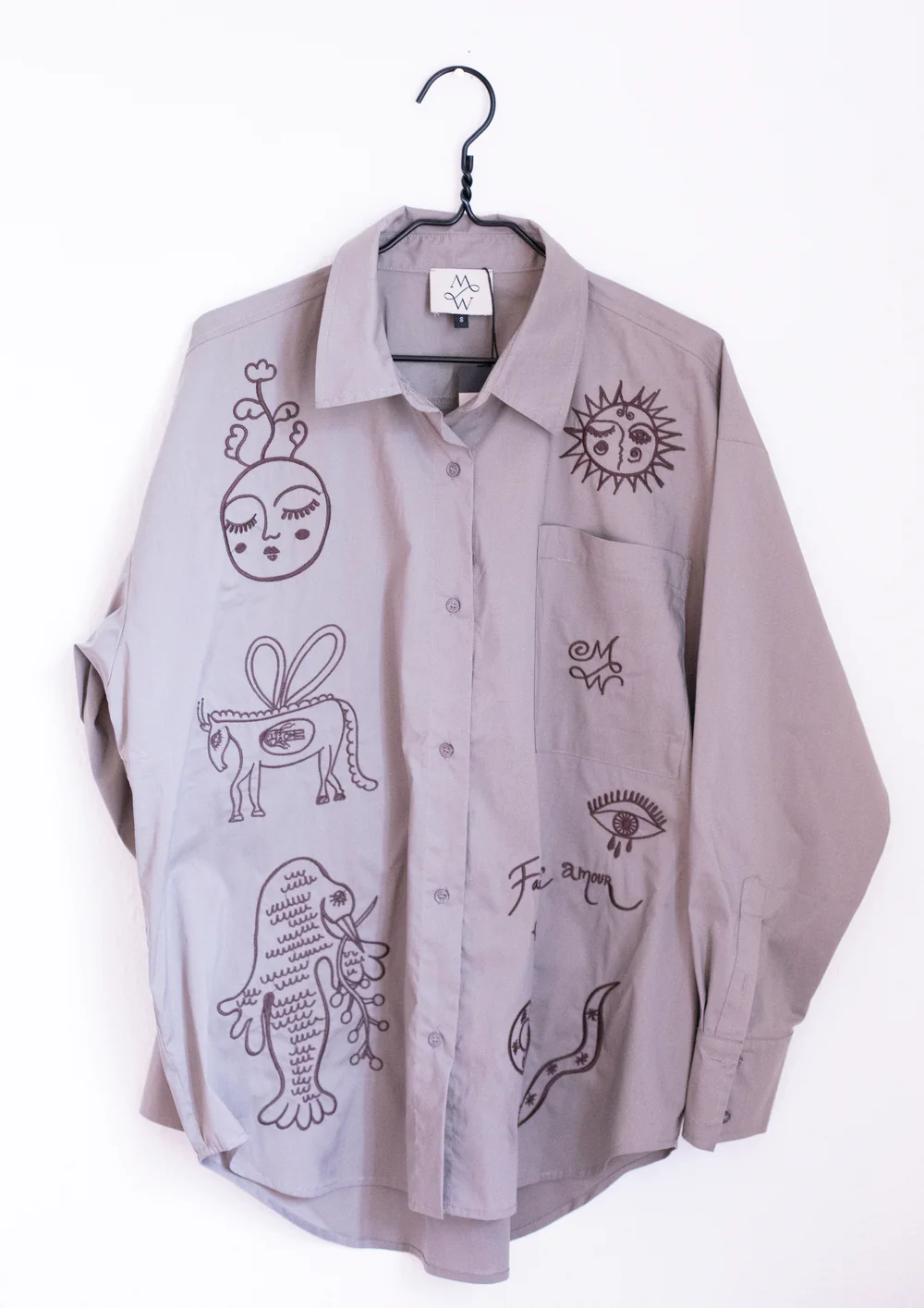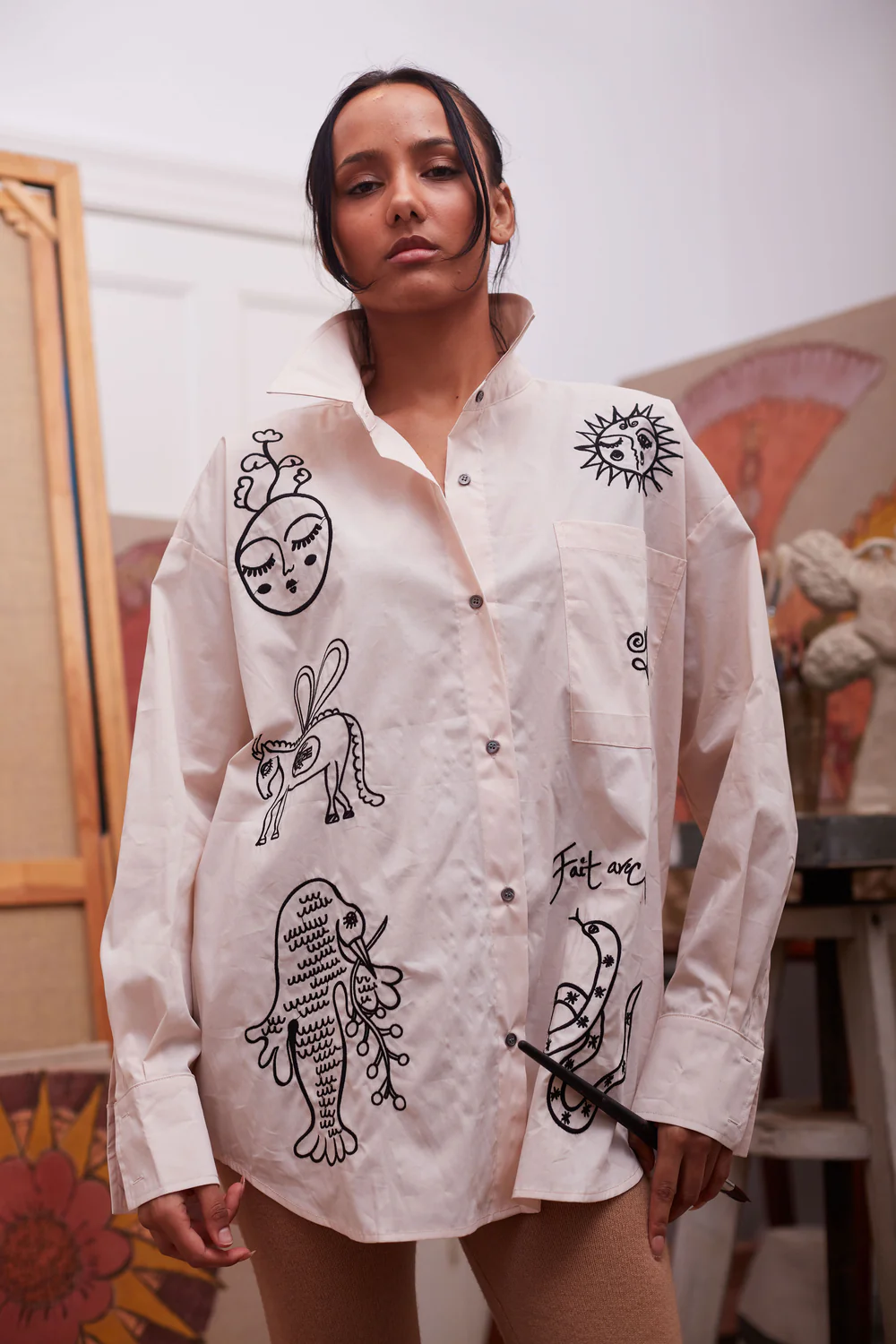 Fed skjorte fra MW. Skjorten her fåes i clay og ecru. Skjorten er en oversized model, med meget flotte broderinger både foran og bagpå. Skjorten har 1 brystlomme og knaplukning foran.