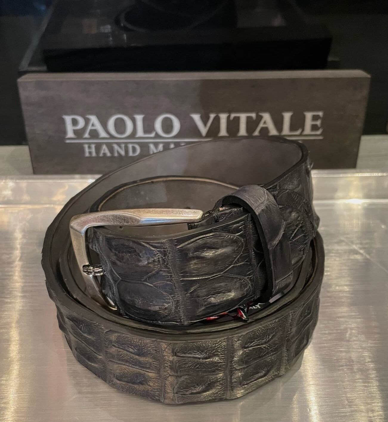 Lækkert krokodilleskinds bælte fra Paolo Vitale i nuancerne grå/sort.