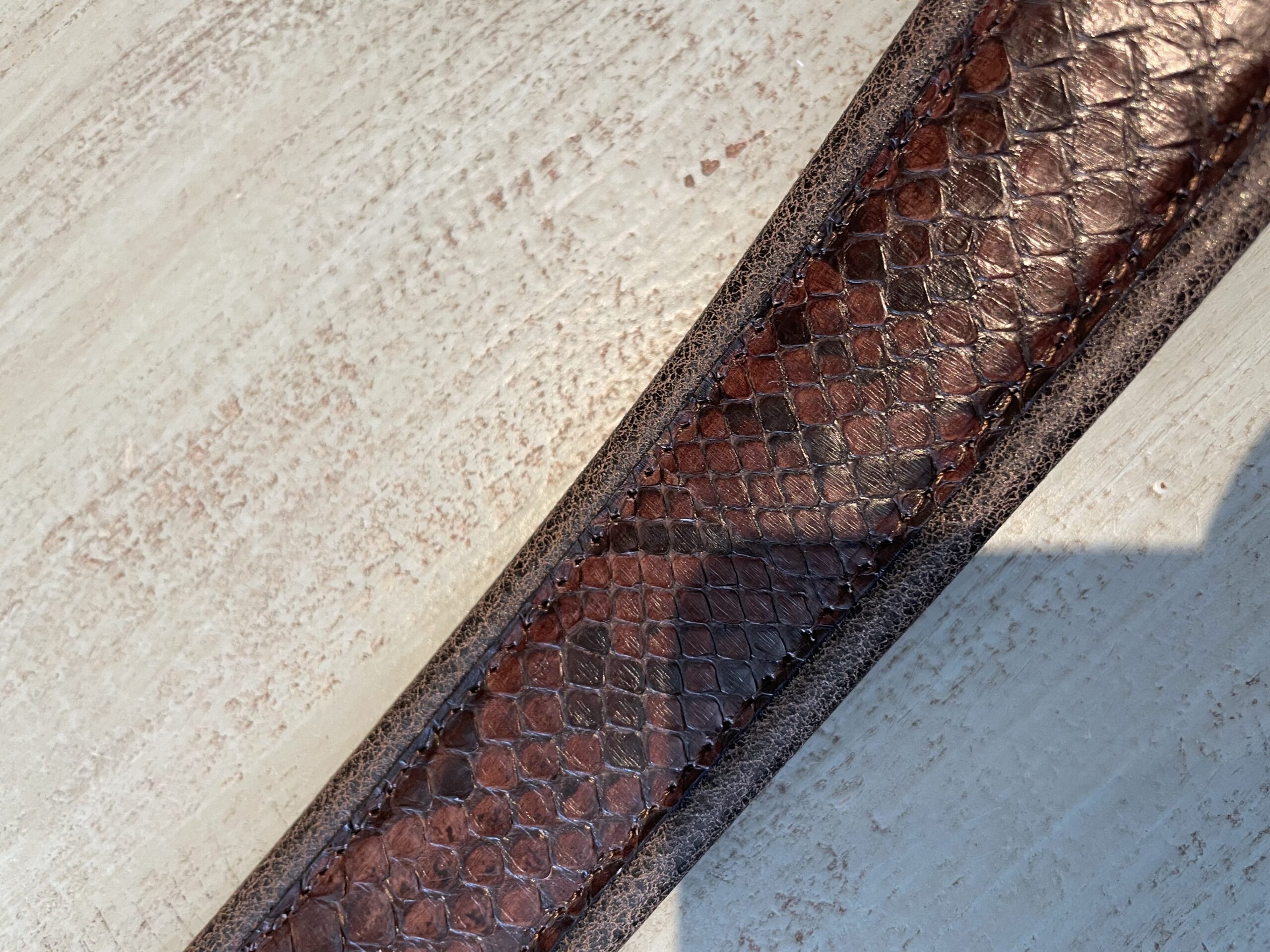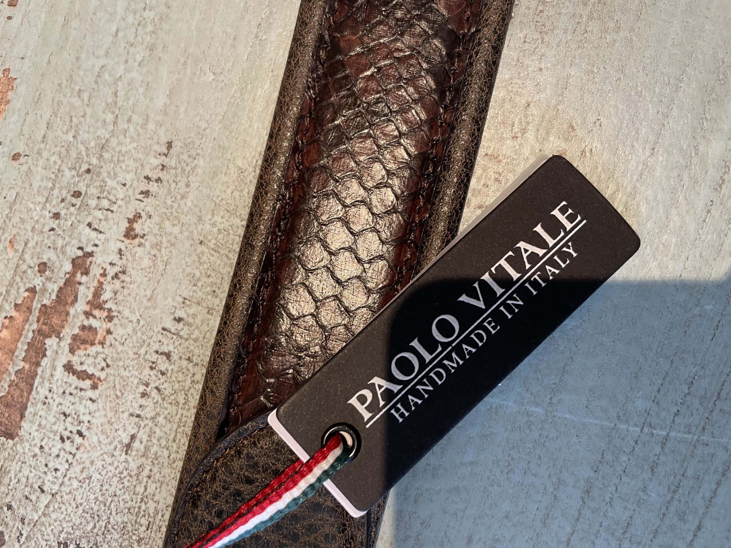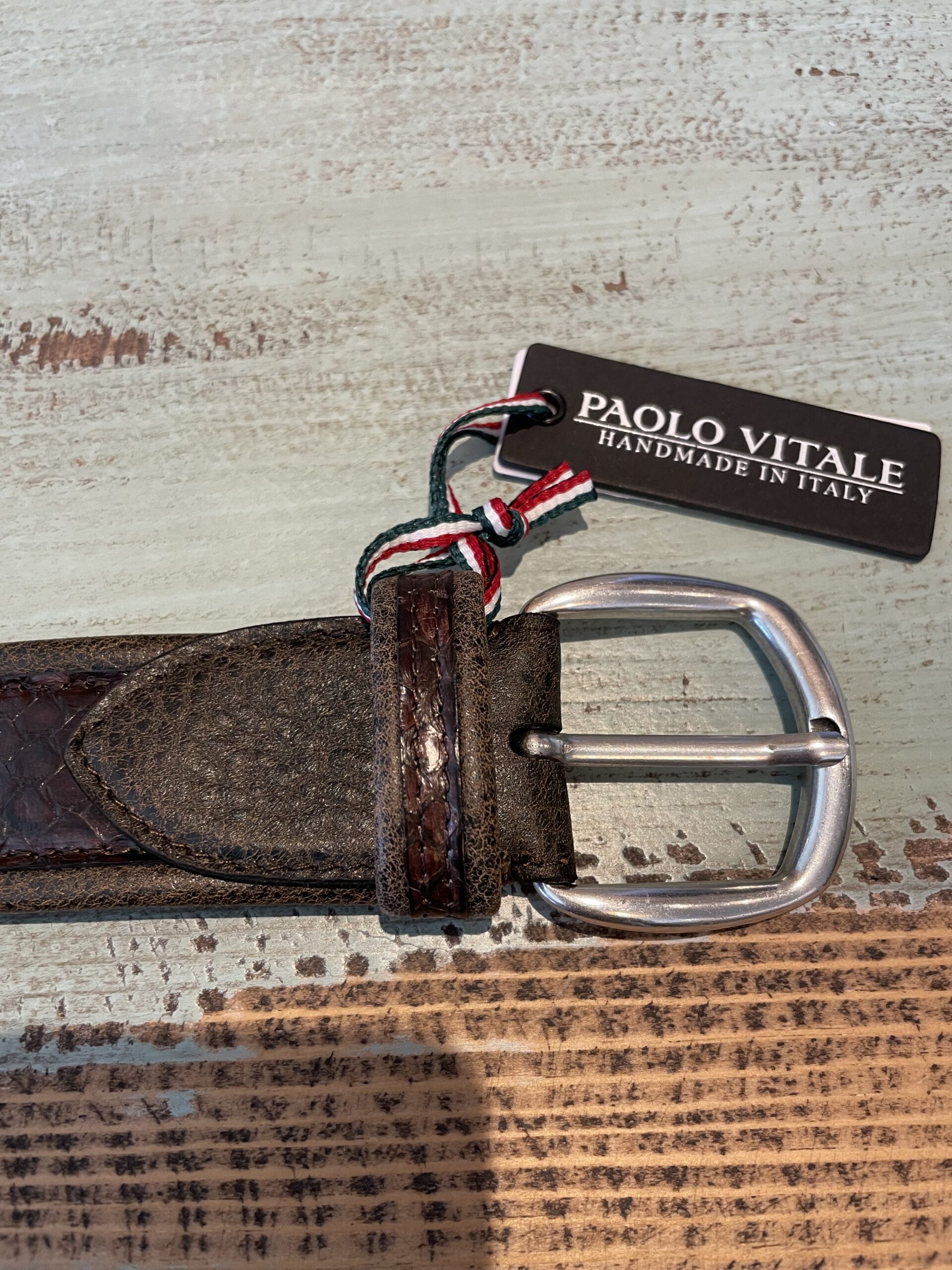 Flot, brunt pyton bælte fra Paolo Vitale. Bæltet er slebet pythonskind og er håndlavet i Italien. Den flotte struktur giver bæltet et eksklusivt og lækkert udtryk, der kan styles til enhver lejlighed.