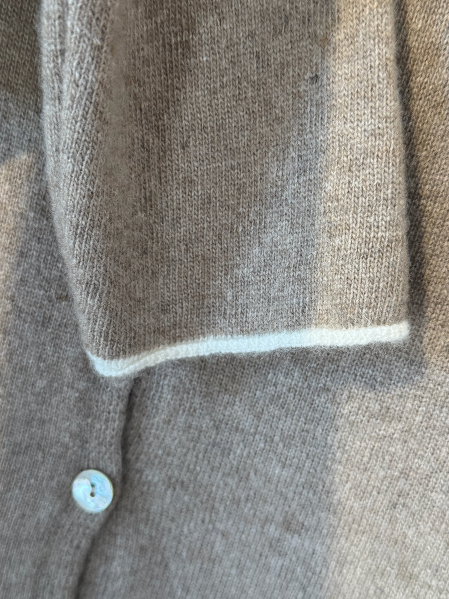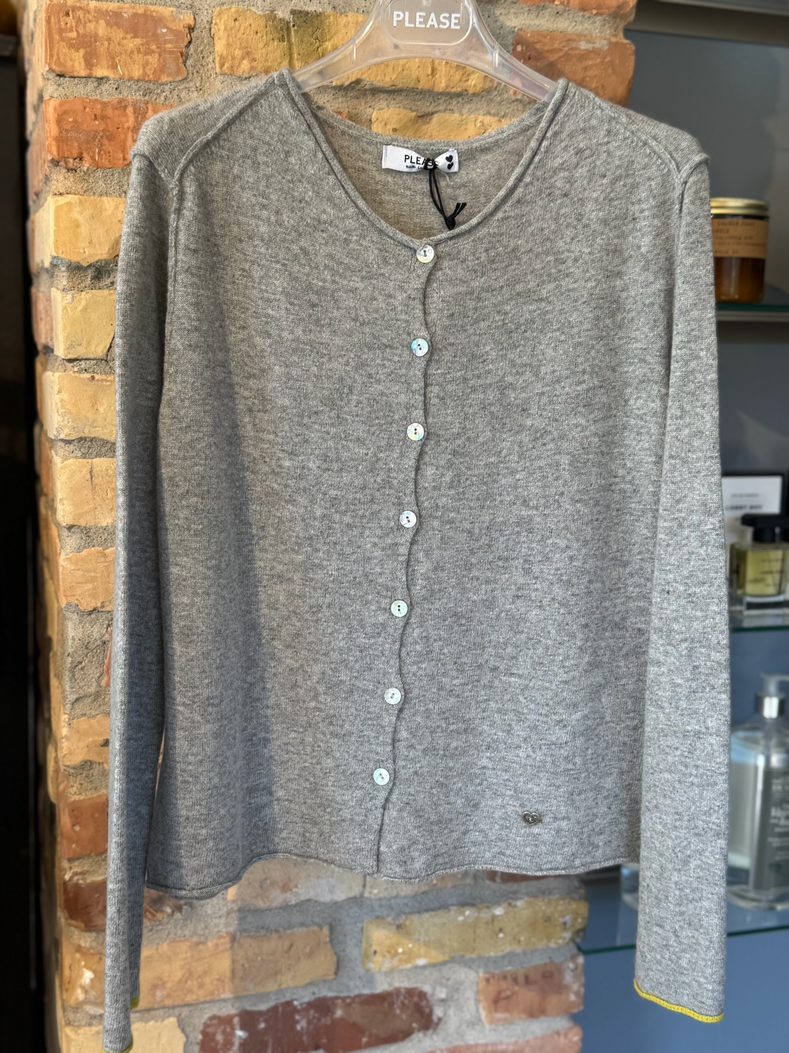 Lækker og blød cardigan fra Please. Cardiganen er lavet i en let tynd strik, med fine knapper til lukning foran. Cardiganen har rund halsudskæring og små slids i siderne, samt en farvet kant på ærme afslutningen. Cardiganen fåes i sand og grå.