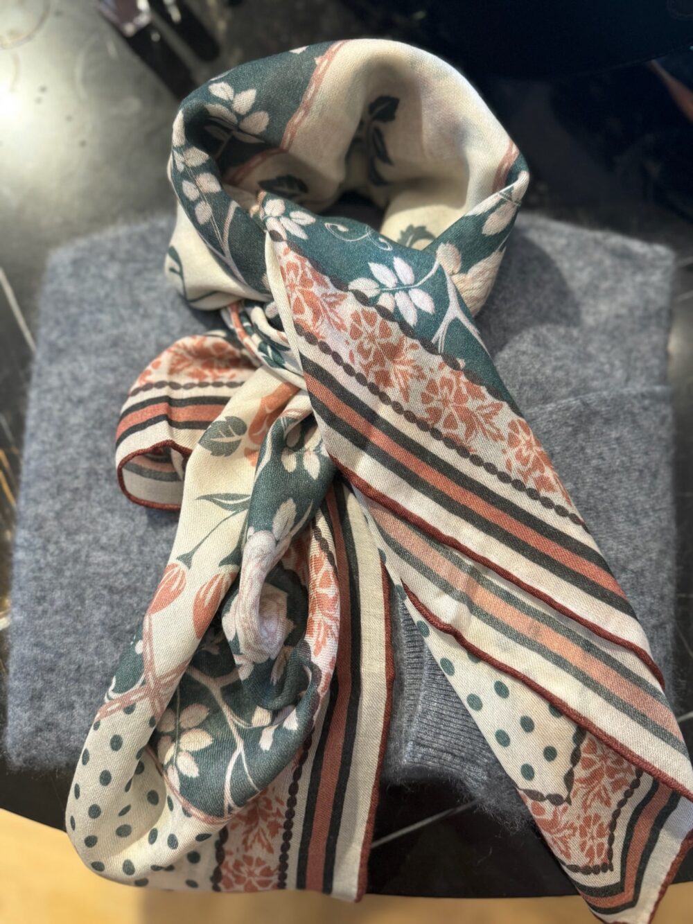 Meget lækkert ude tørklæde fra Plissé Copenhagen. Tørklædet er lavet i tynd, lækker uld. Super skønt at have rundt om halsen og så endda i flotte farver og mønster.