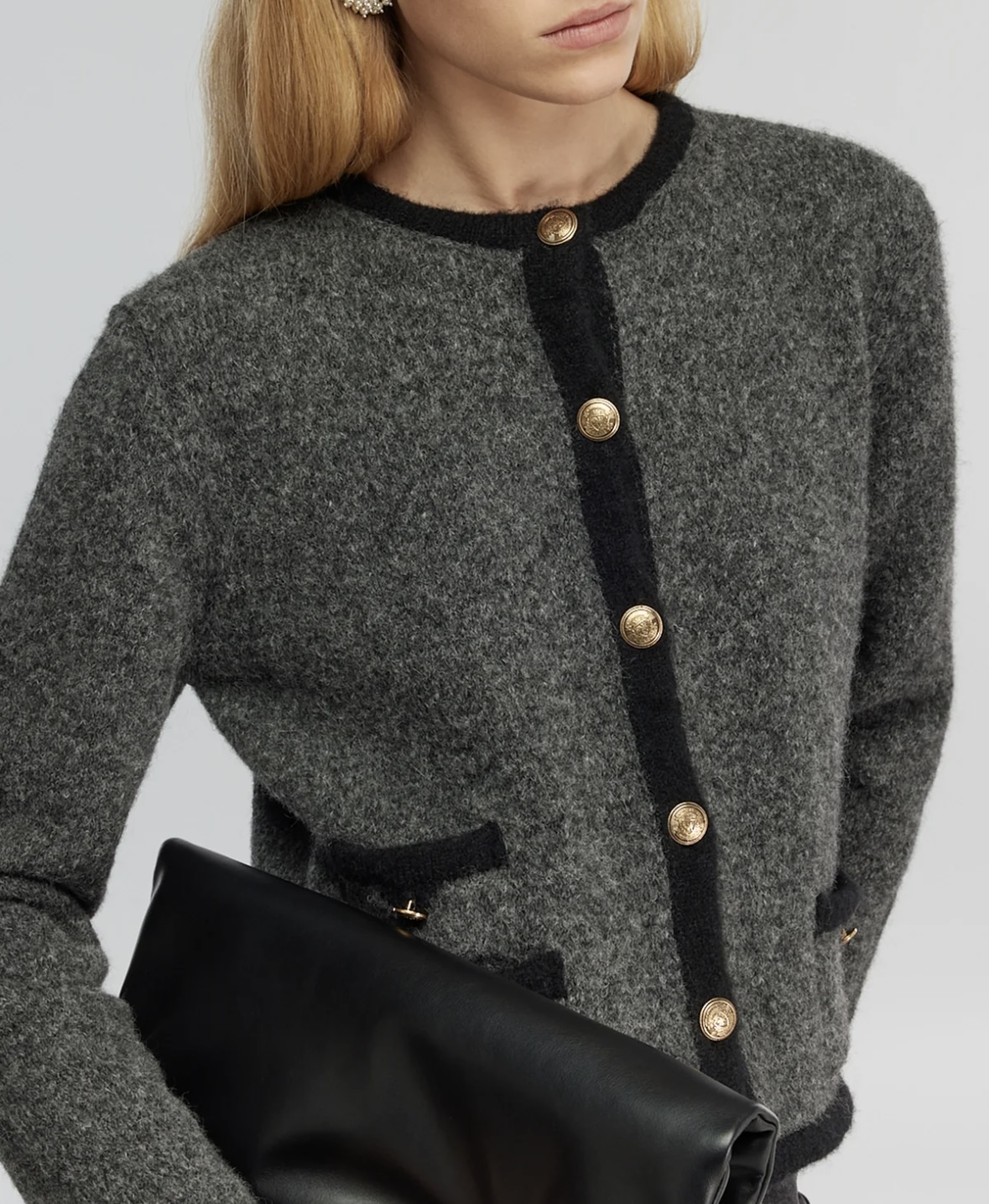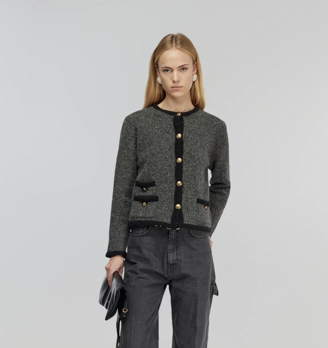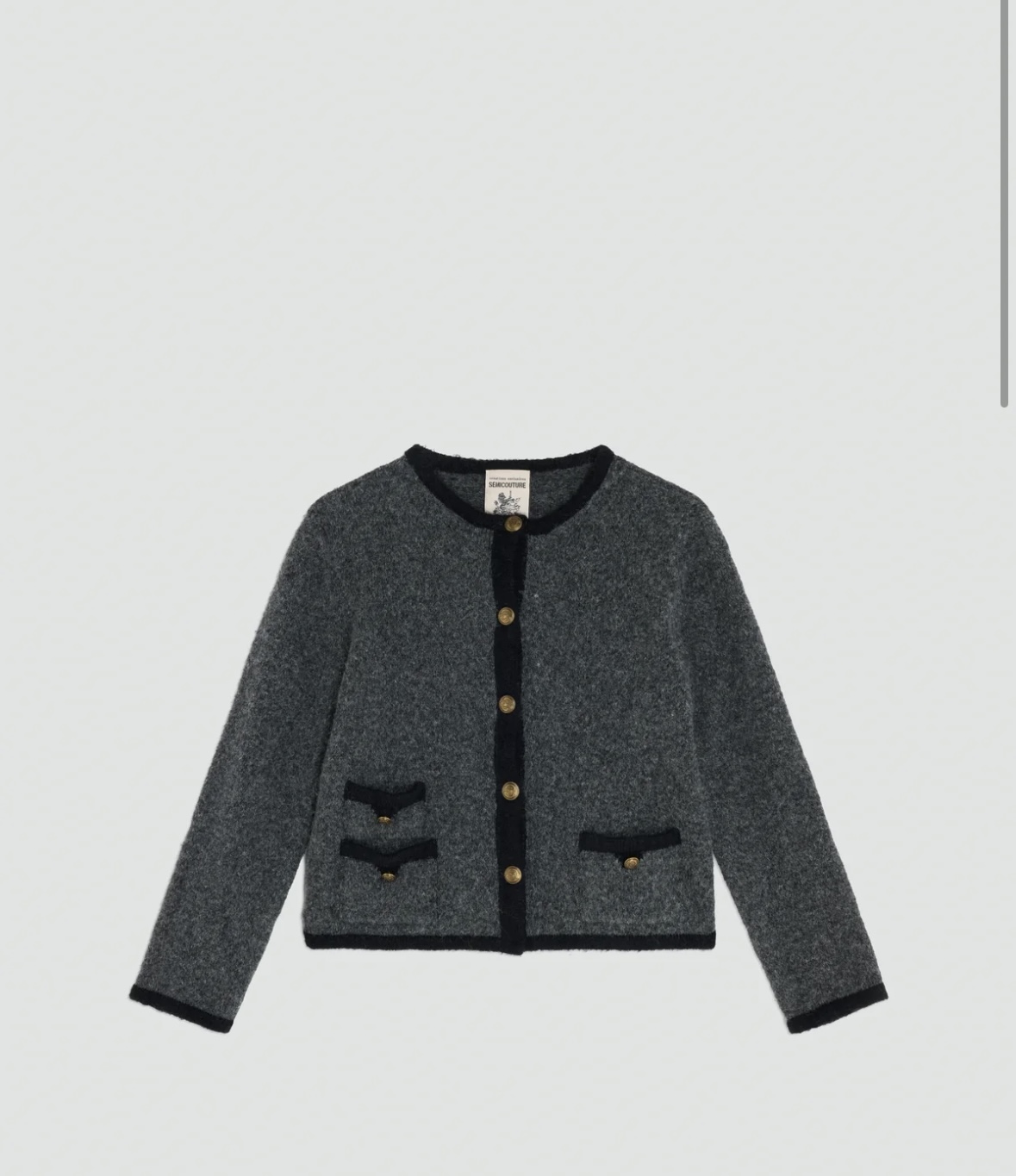 Lækker og blød cardigan fra italienske Semi Couture. Cardiganen er grå, med sorte kanter og afslutninger, med lækre eksklusive guld knapper. Cardiganen har 2 dekorative forlommer, med guldknapper.