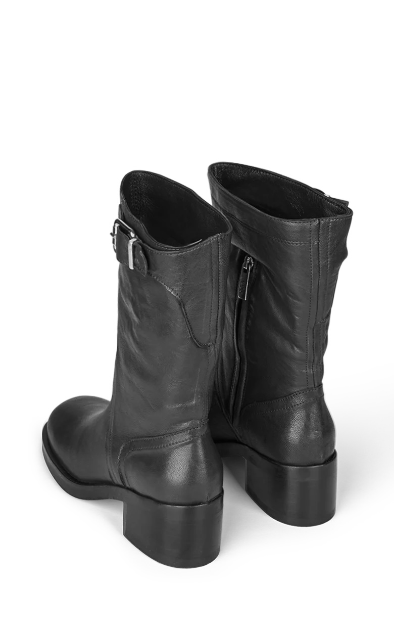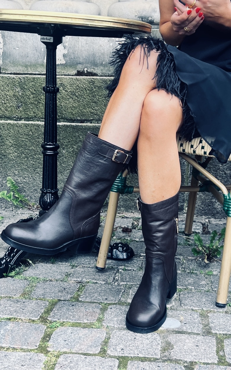 Super smukke støvler med et medium langt skaft, lynlås på indersiden og et spænde på ydersiden. De har en afrundet snude og en blød hæl på 5,5 cm.