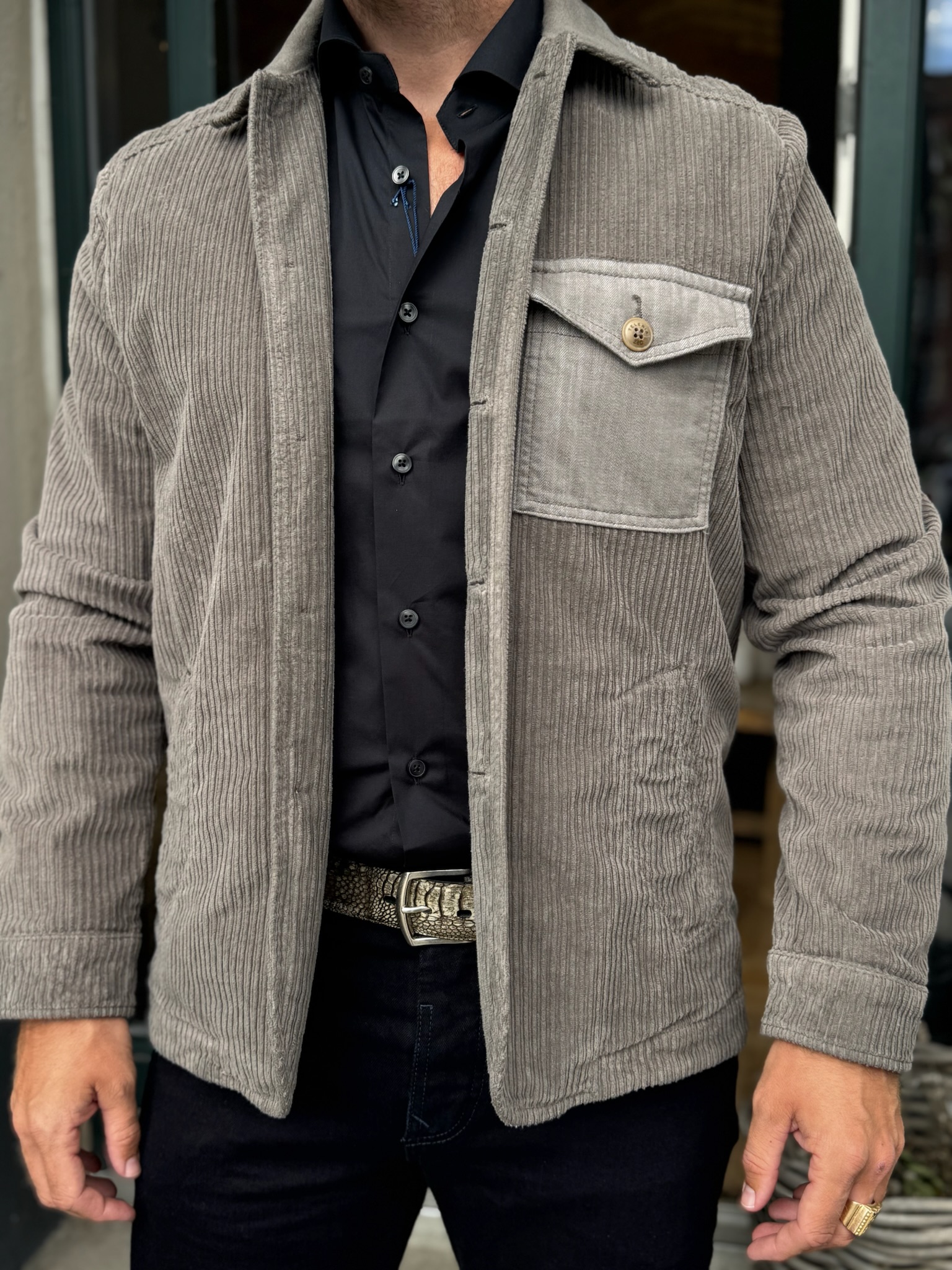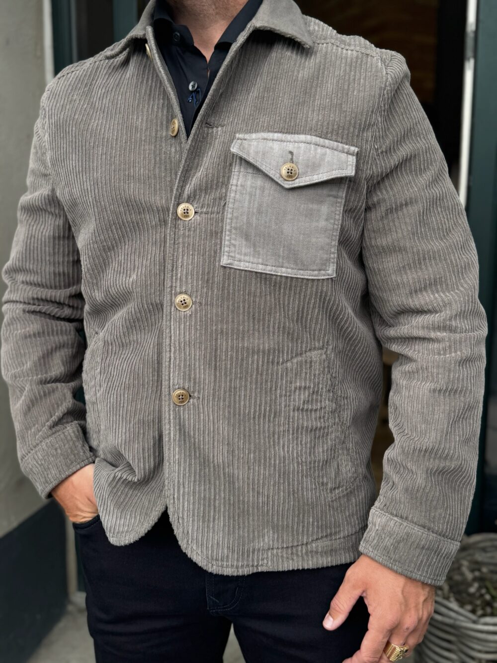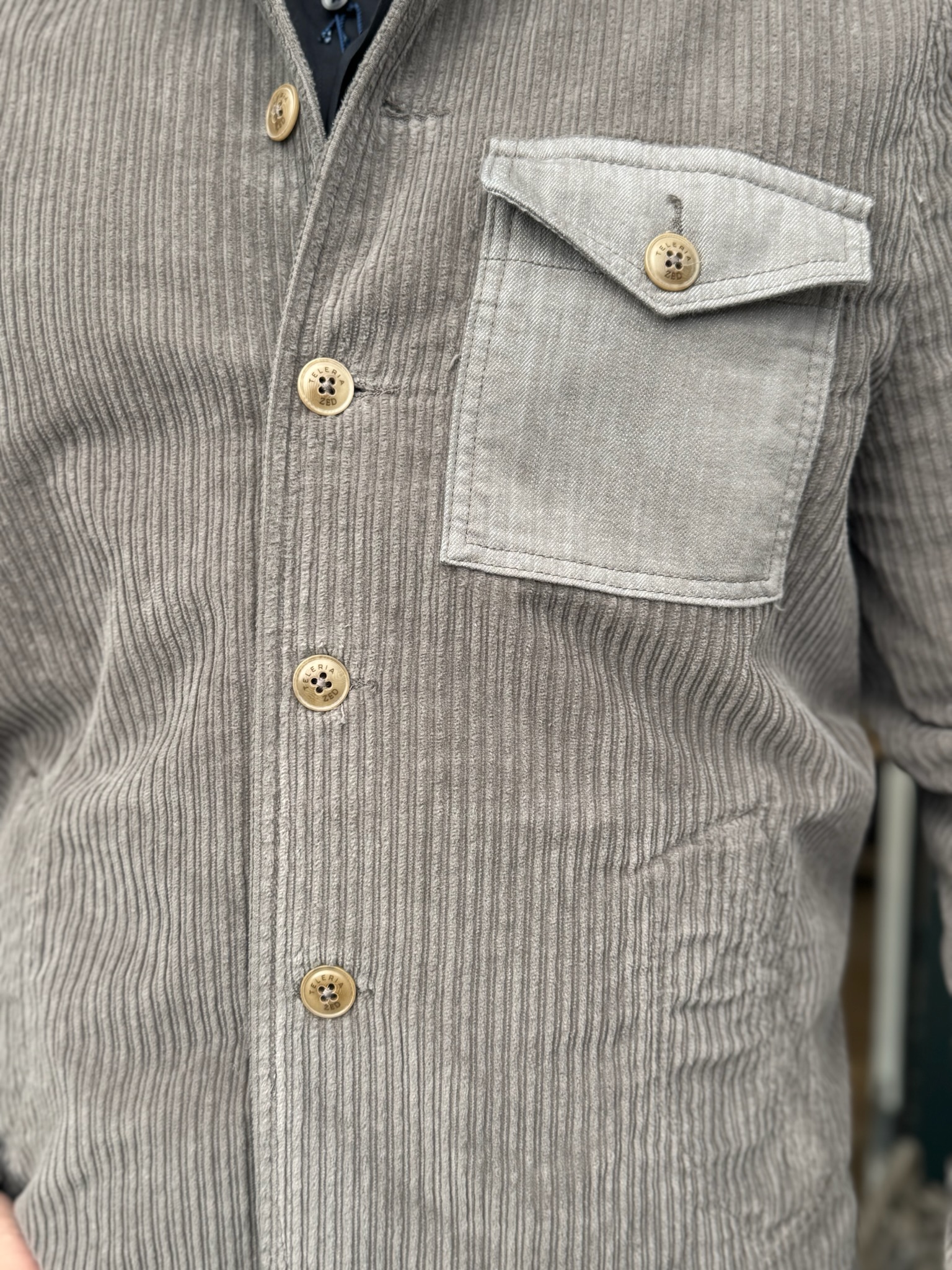 Super fed jakke fra det nye italienske mærke Teleria Zed. Jakken er lavet i gråt fløjl, med almindelig krave og en påsyet lomme i et andet stof. Jakken lukkes med knapper foran.