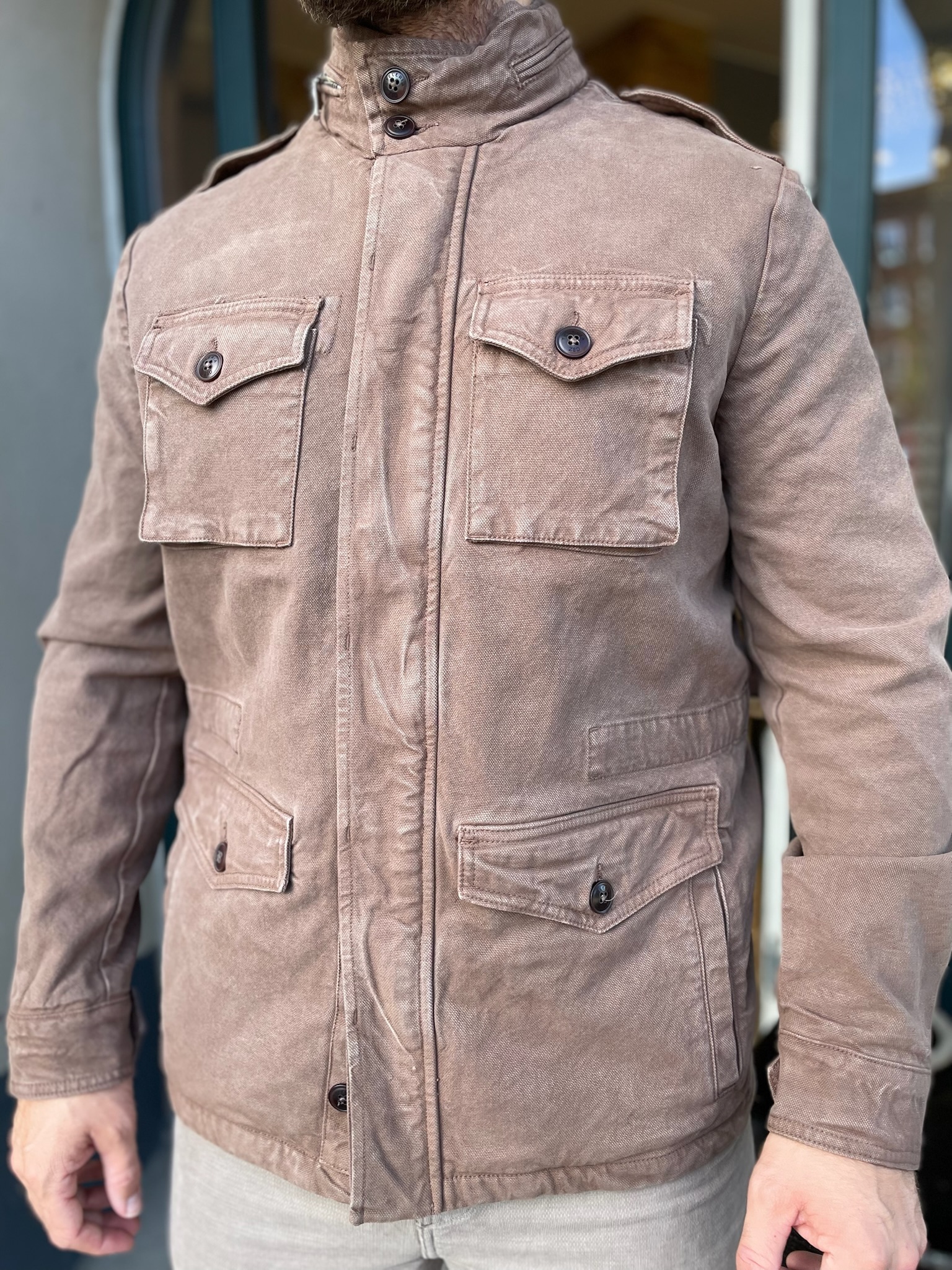 Super fed jakke fra Teleria Zed. Jakken er lavet i en fed rustfarvet vask. Jakken har 2 forlommer og 2 brystlommer med knaplukning, samt lynlås  og knaplukning foran. Jakken har snører som kan strammes ind, for at skabe noget figur i jakken.