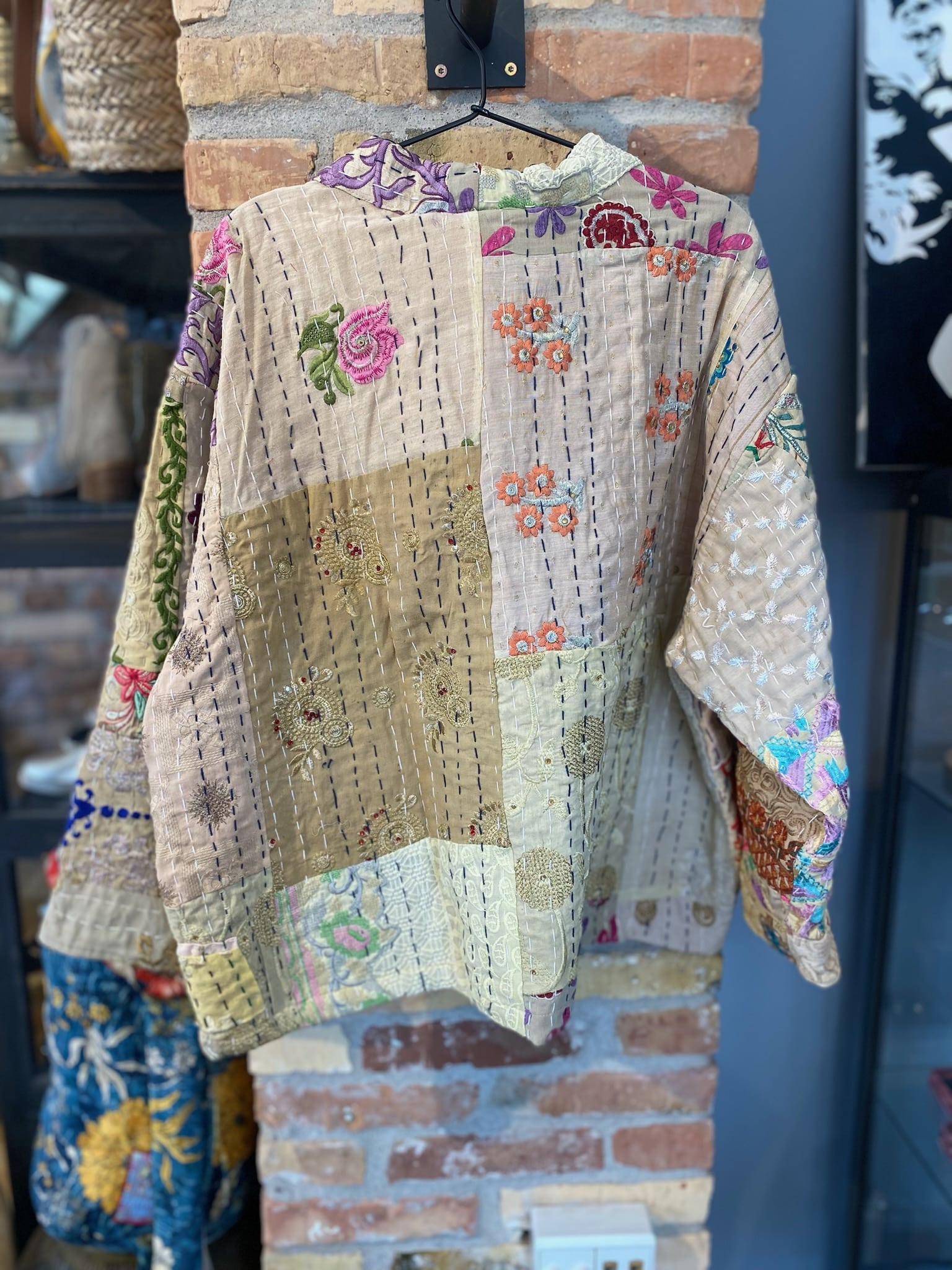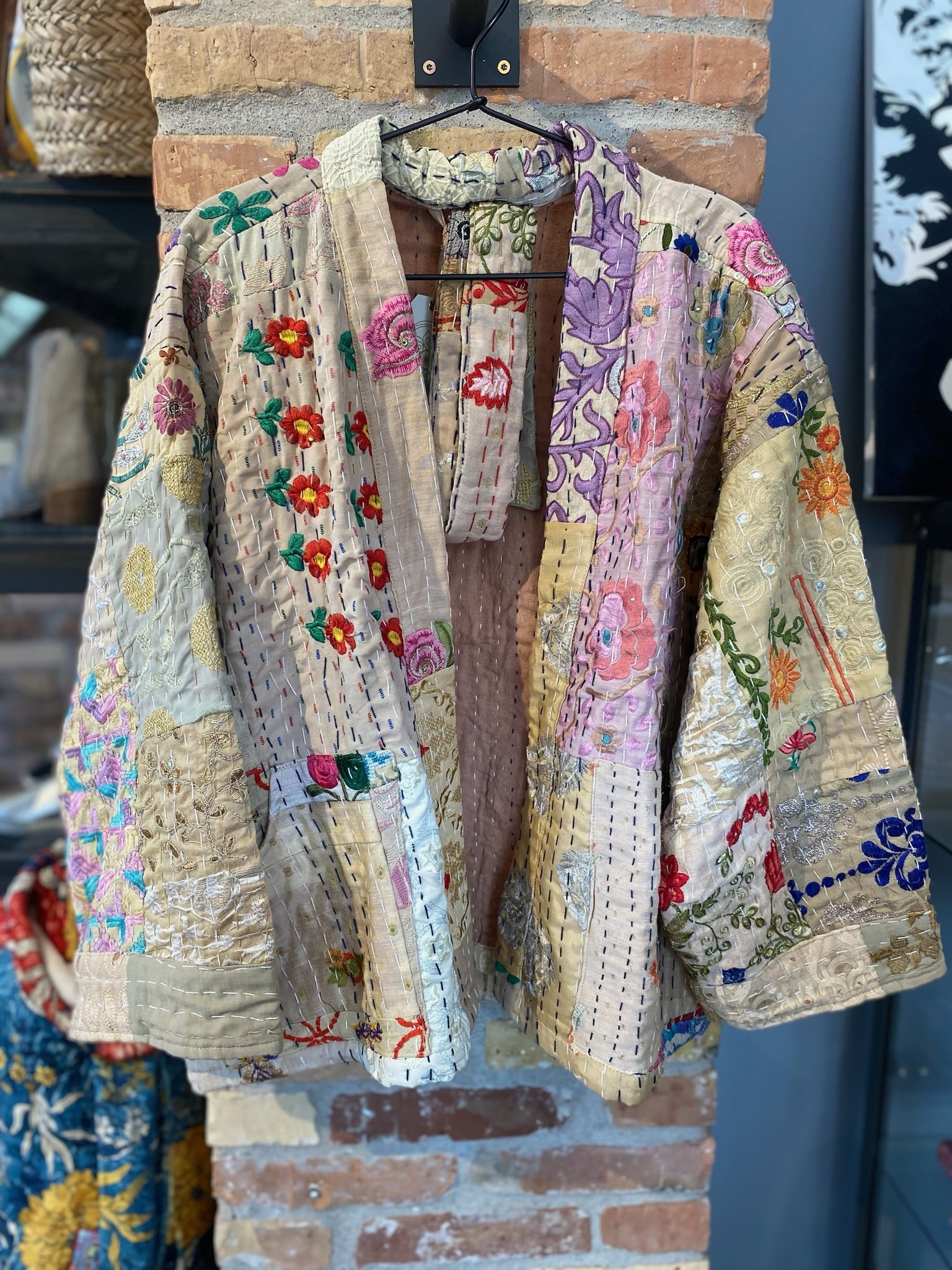 Super skøn jakke fra Wauw. Jakken er unika og dermed unik, hvoraf ingen andre er ens. Jakken er onesize og har medfølgende bælte. Jakken er lavet i patchwork agtig stil, hvor forskellige unikke stykker stof er sat sammen.