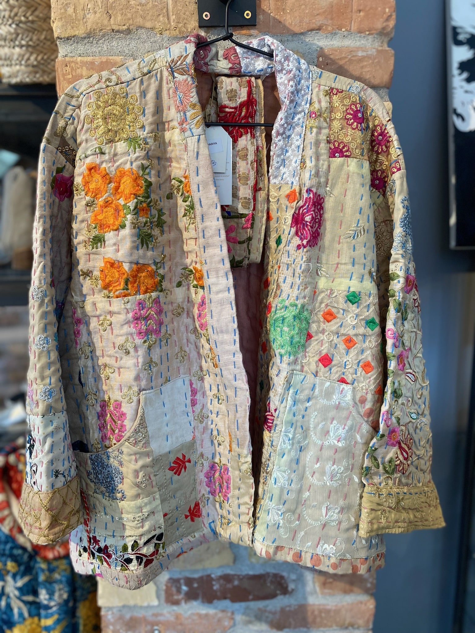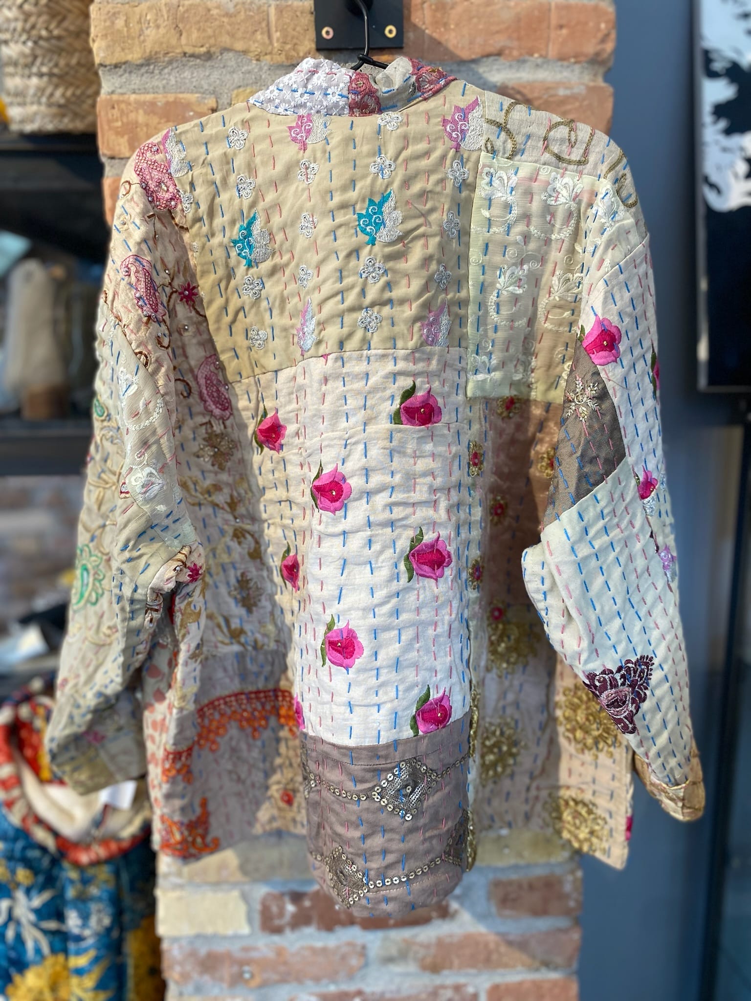 Super skøn jakke fra Wauw. Jakken er unika og dermed unik, hvoraf ingen andre er ens. Jakken er onesize og har medfølgende bælte. Jakken er lavet i patchwork agtig stil, hvor forskellige unikke stykker stof er sat sammen.