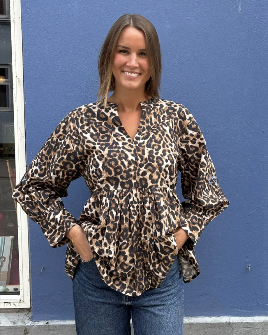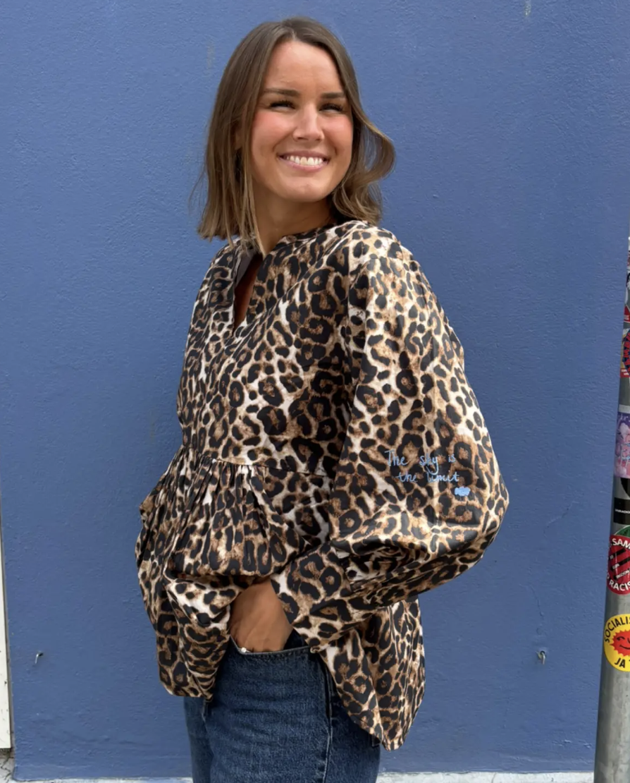 Fin bluse fra Wauw’s pre-fall kollektion. Blusen er lavet i et fint leopard print, med fine detaljer med flot skrift på ærmerne.