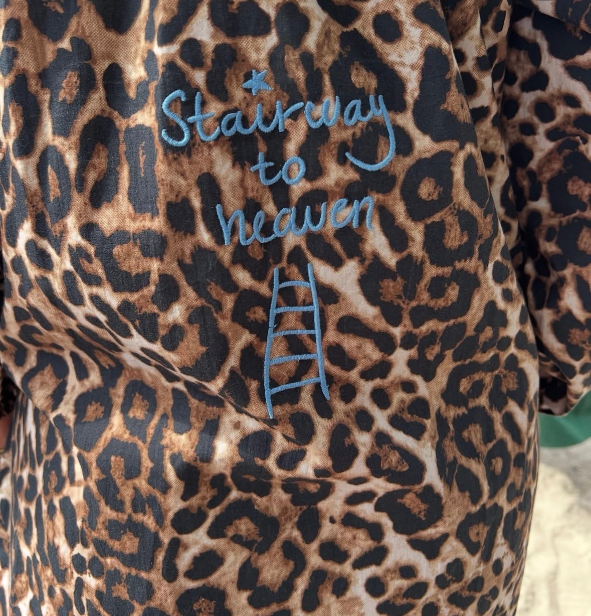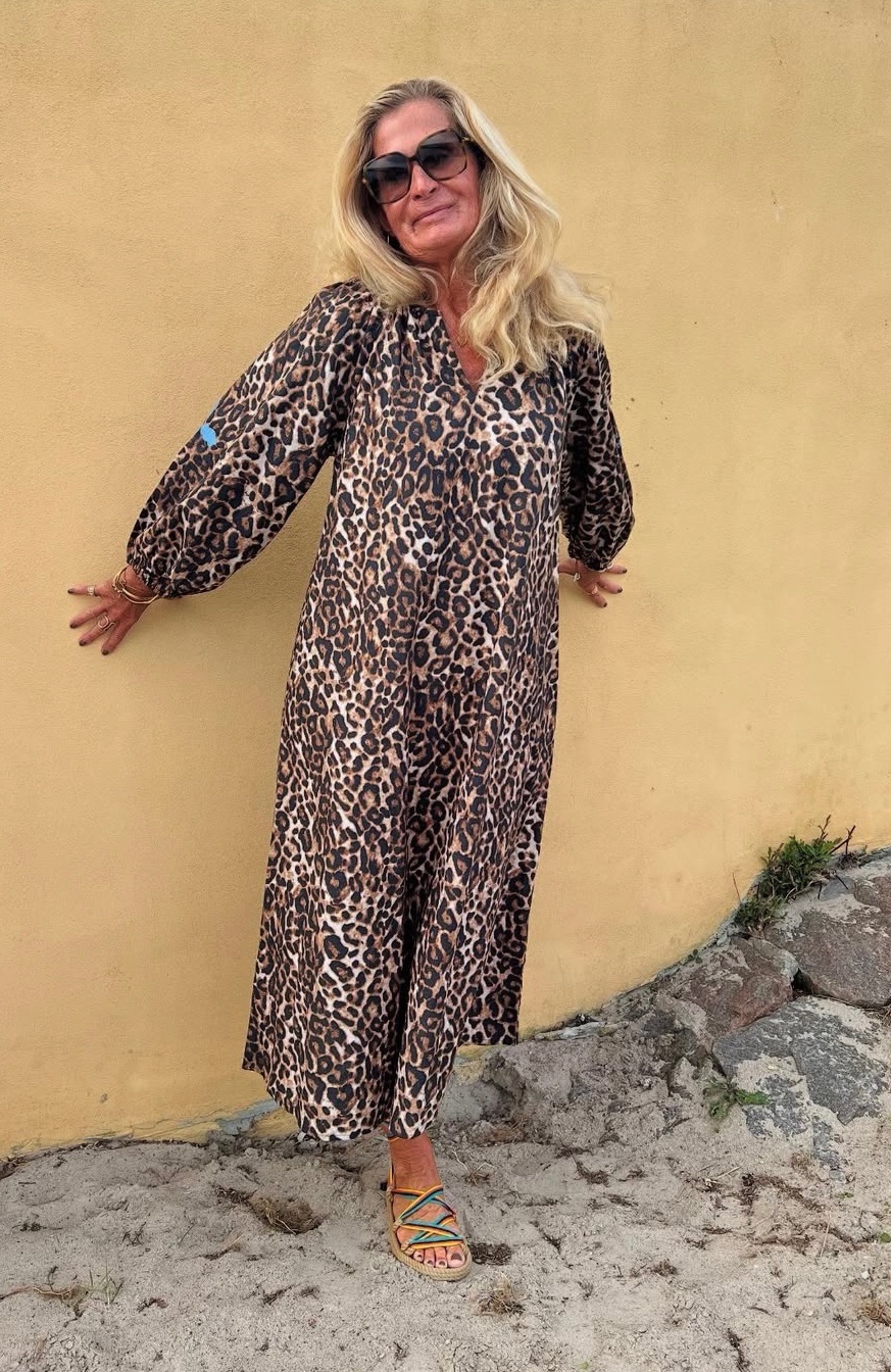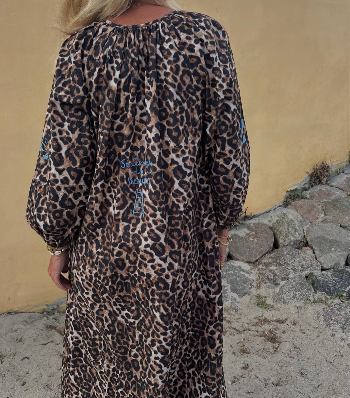 Smuk kjole fra Wauw i leopard print. Kjolen har lange ærmer med elastik afslutning. Kjolen har v-udskæring og er dekoreret med fine statements og skrift.