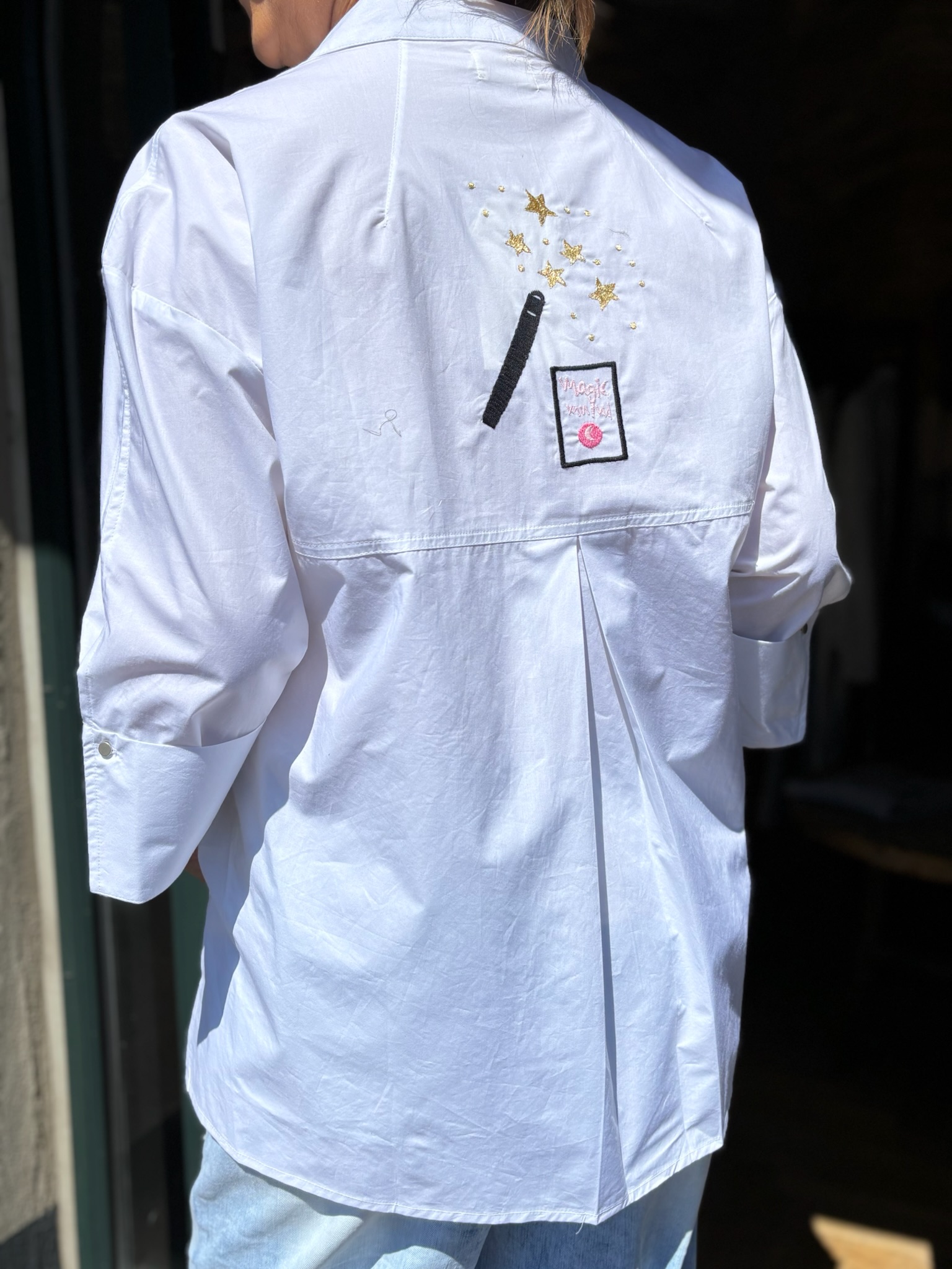 Super smuk skjorte fra Wauw. Skjorten har et loose fit, med kinakrave og skjult knaplukning. Skjorten har skrift foran på brystet og mønstre bagpå ryggen. Skjorten har en lidt v-udskæring, som åbner skjorten flot op.