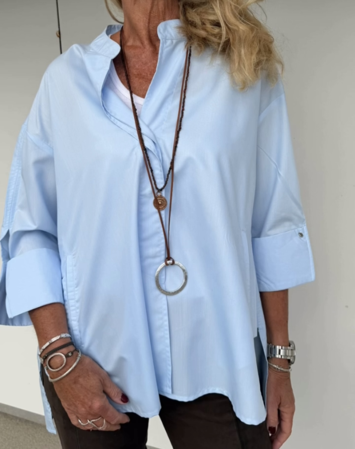 Super smuk skjorte fra Wauw. Skjorten har et loose fit, med kinakrave og skjult knaplukning. Skjorten har fede lapper bagpå med teksten ‘wauw you look good’. Skjorten har en v-udskæring, som åbner skjorten flot op. Skjorten har sidelommer.