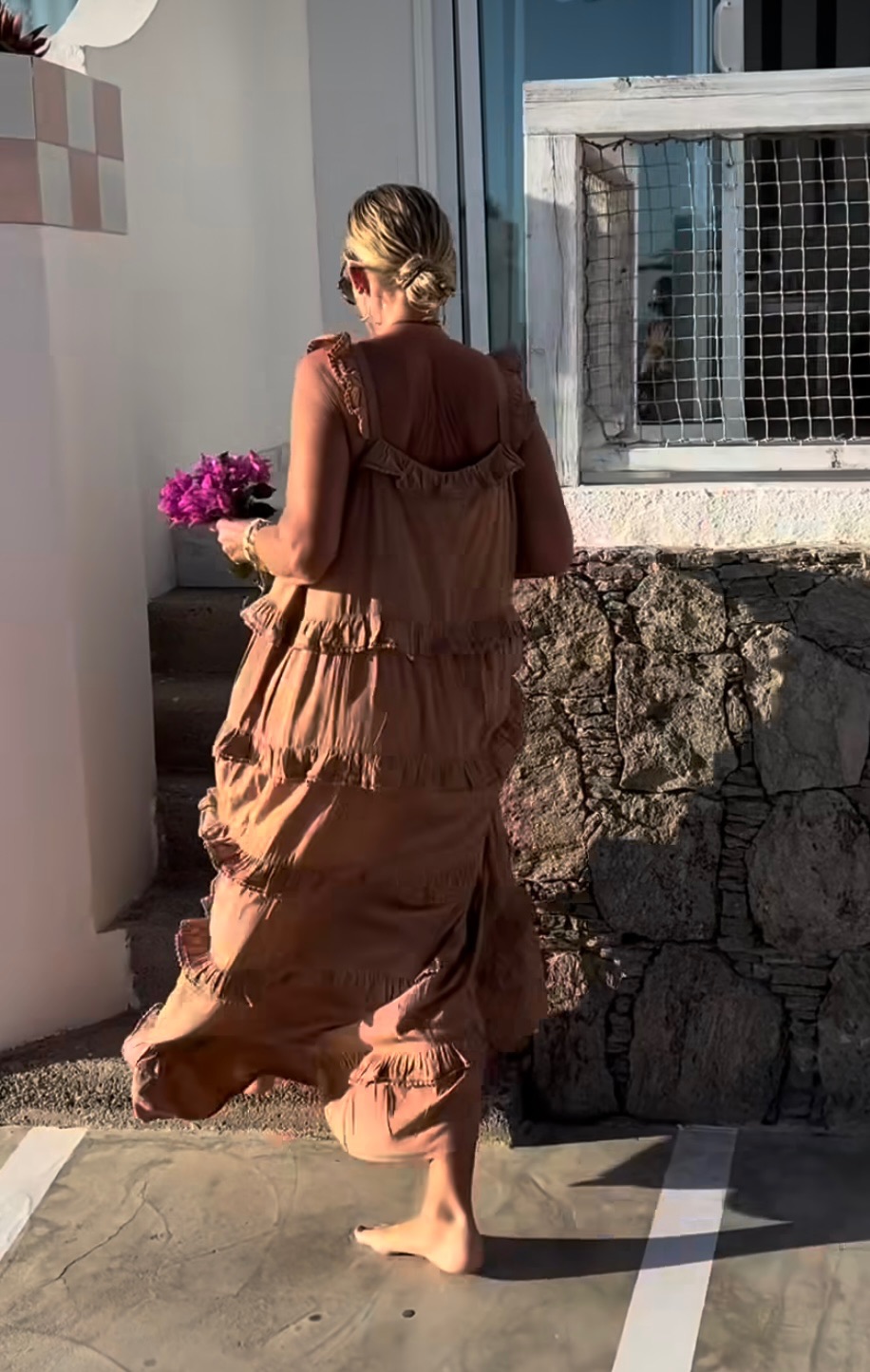 Smukkeste sommerkjole fra Wauw. Kjolen er helt lang, med flotte og fine flæser hele vejen ned og på ærmer. Kjolen er i farven ‘mocha mousse’, som er en skøn varm brunlig farve.