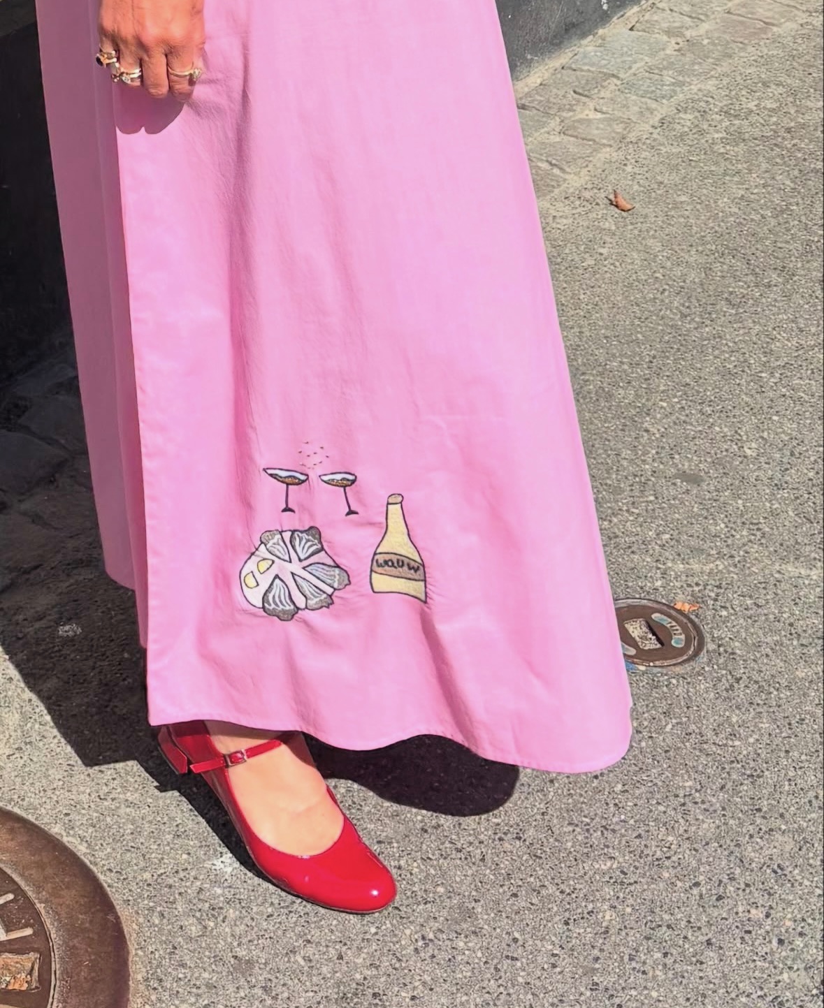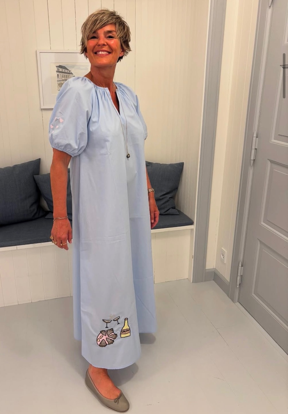 Fantastisk sommerkjole fra Wauw. Kjolen er kortærmet og helt lang, med en lille v-udskæring. Kjolen er dekoreret med smukke mønstre og motiver, som er diskret men som giver kjolen så meget personlighed og charme. Kjolen fåes i pink og lyseblå.