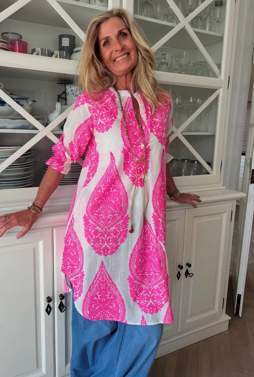 Lækker tunika fra Wauw. Denne tunika er pink og hvid i et smukt mønster. Tunikaen har halv knaplukning foran og et oversized fit. Den har 3/4 ærmer med elastik.