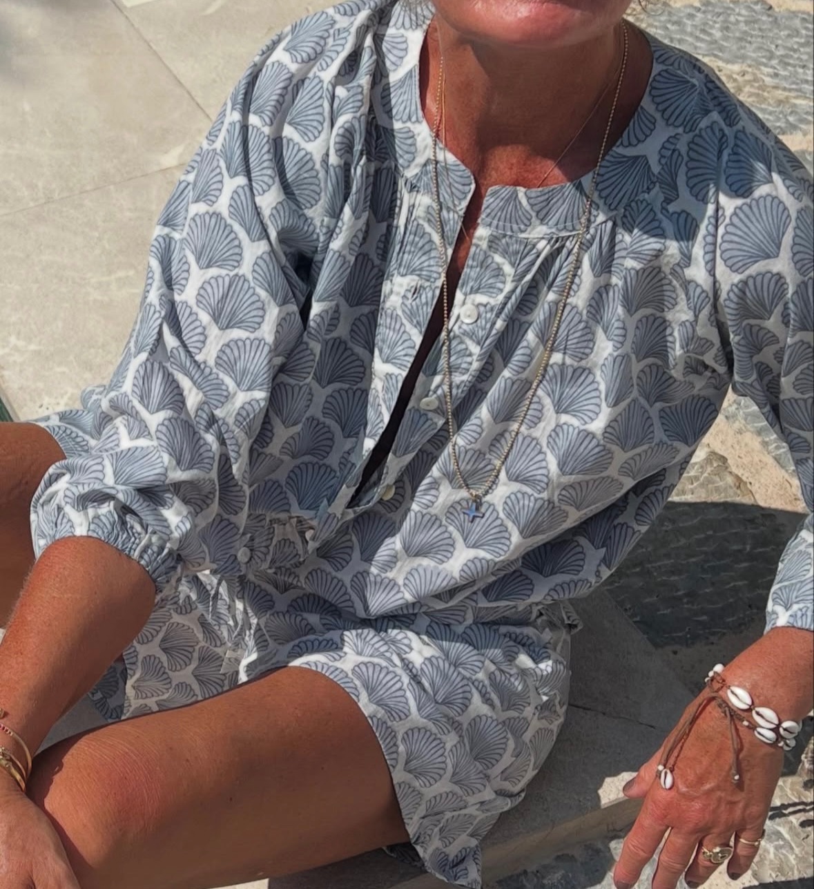 Fin skjorte fra Wauw, dekoreret med muslingeskaller i blå og hvid. Skjorten har lange ærmer, med elastik afslutninger og et let og løst fit. Style skjorten med de matchende shorts og få et skønt og charmerende sommersæt.