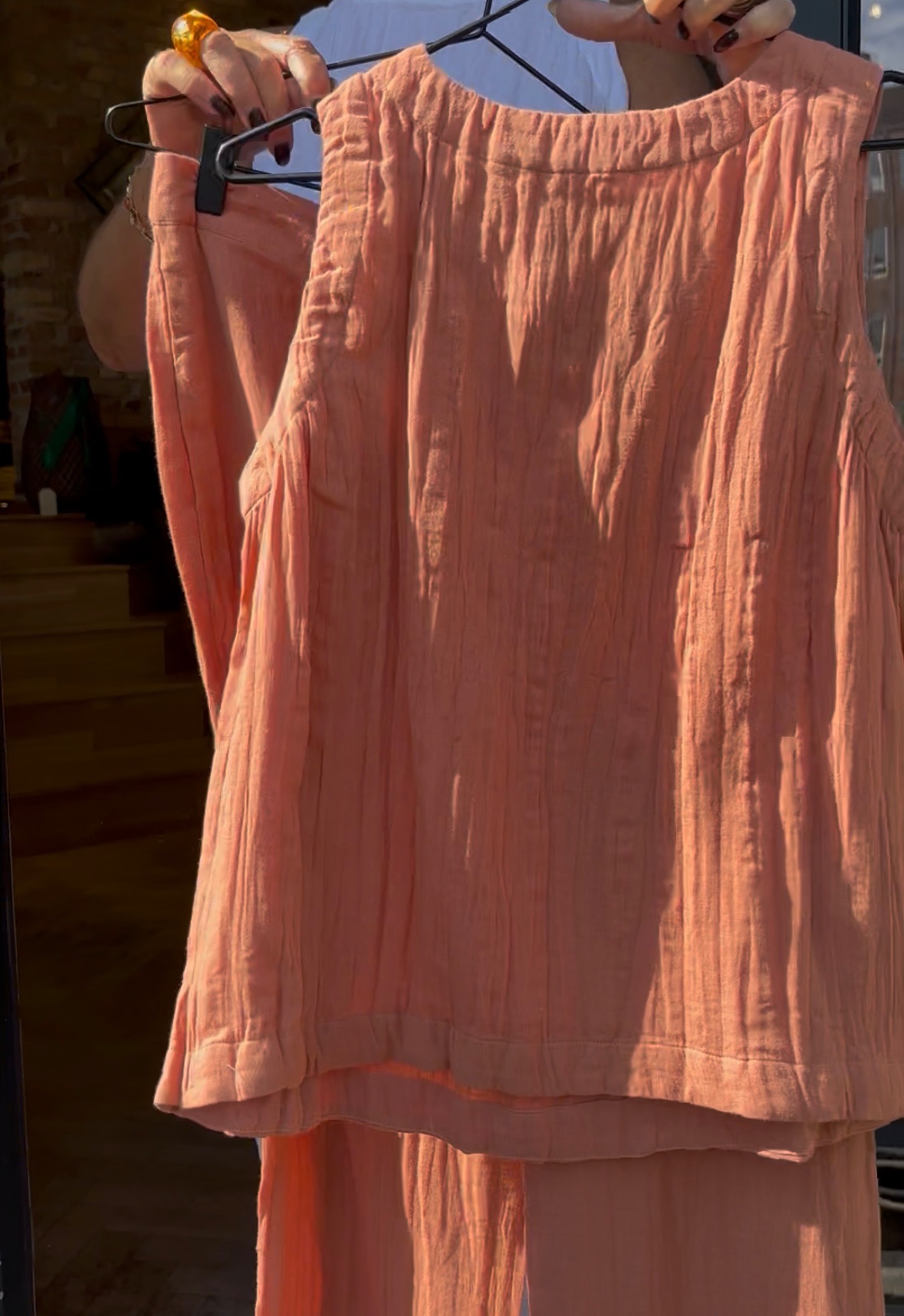 Skøn top fra Wauw, i en blød vaflet bomulds kvalitet. Toppen lukkes med en knap bagpå og fåes i hvid og terracotta.