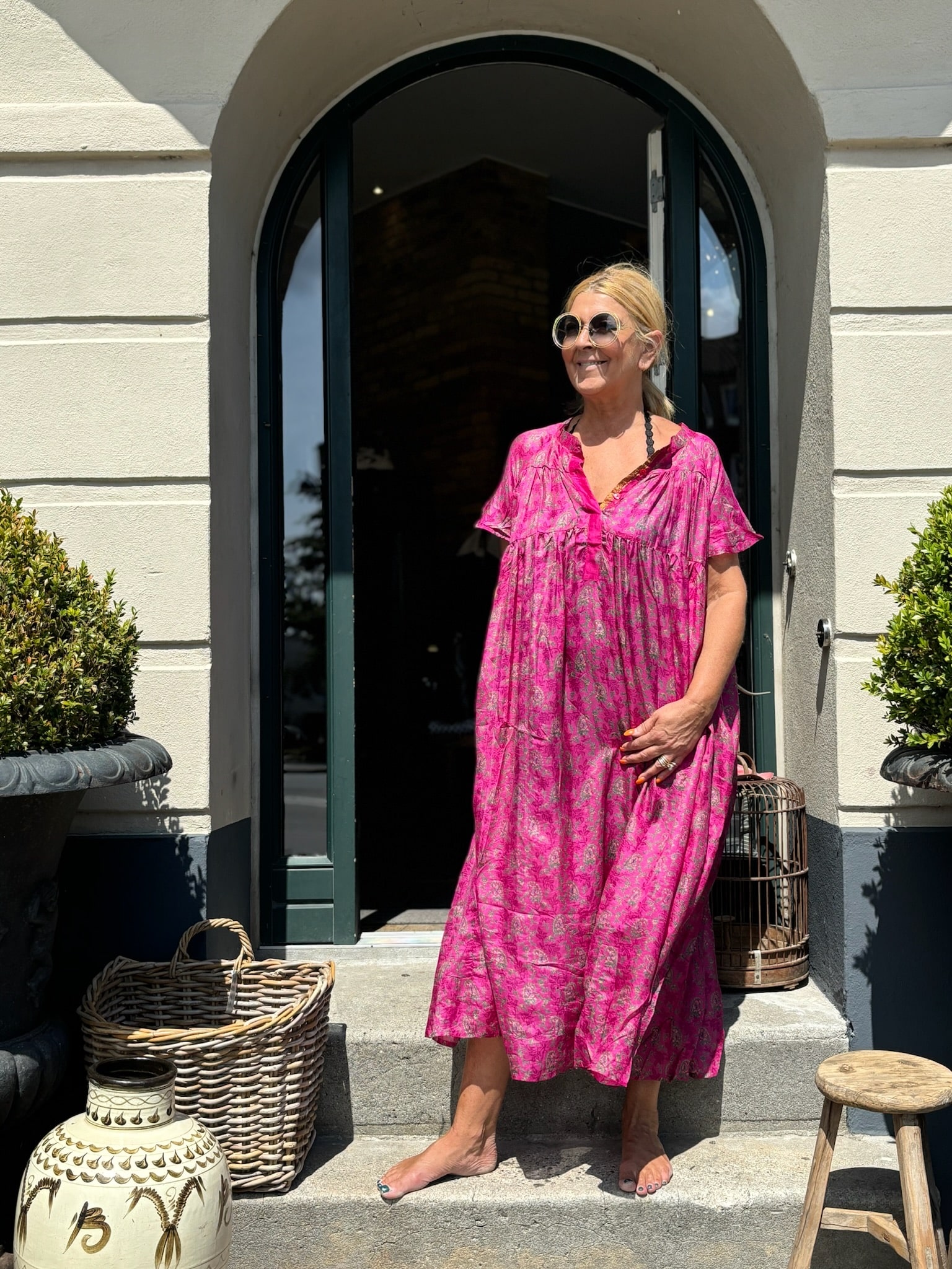 Skøn sommerkjole fra Wauw. Kjolen her er lavet i silke, som gør den blød og super let. Kjolen er lang, med korte ærmer og v-udskæring med knapper. Kjolen er unika og derfor findes der kun 1 af hver, hvilket gør den super speciel.